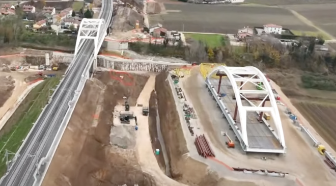 A San Bonifacio, in provincia di Verona, è stato completato il varo di un imponente ponte ferroviario sul torrente Alpone, un’opera fondamentale nei lavori della nuova linea ferroviaria AV Milano–Venezia nella tratta Verona-Padova. La struttura, lunga circa 78 metri e caratterizzata da un design ad arco in acciaio, è stata realizzata in due fasi principali,…