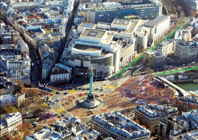 Attualmente la Place de la Bastille di Parigi è fondamentalmente uno spartitraffico: un importantissimo monumento si trova nel mezzo di una strada piena di auto, non c’è modo di attraversarla a piedi in modo facile e sicuro. Ma presto tutto ciò cambierà. La piazza è uno dei sette spazi pubblici importanti che Parigi sta riqualificando per pedoni e ciclisti.