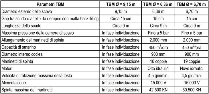 La maggior parte dello sviluppo sotterraneo del tracciato (circa 13.400 m) viene realizzato mediante scavo meccanizzato, attraverso l’utilizzo di due geometrie di TBM: una con diametro di scavo pari a 9,15 m, e l’altra con diametro di scavo pari a circa 6,36 m. In totale sono previste sei TBM utilizzate per lo scavo delle seguenti tratte: