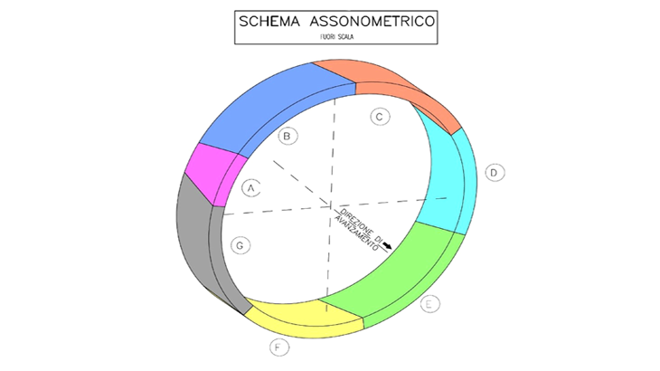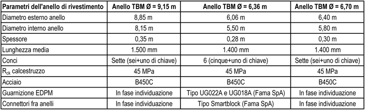 Il rivestimento definitivo della galleria sarà realizzato in conci prefabbricati, posti in opera dalla macchina immediatamente dopo lo scavo, i quali successivamente verranno utilizzati come contrasto dai martinetti di spinta per la fase di avanzamento della TBM. Si susseguono, pertanto, ripetendosi le due fasi principali: lo scavo in avanzamento per una lunghezza pari a quella del concio e il successivo montaggio dell’anello prefabbricato. Lo schema di anello di rivestimento scelto è di tipo universale, costituito cioè da una sequenza di anelli, tutti geometricamente uguali tra loro e dotati di una conicità che consentono – opportunamente ruotati attorno al proprio asse, ciascuno rispetto al precedente già installato – di seguire l’andamento planoaltimetrico del tracciato.