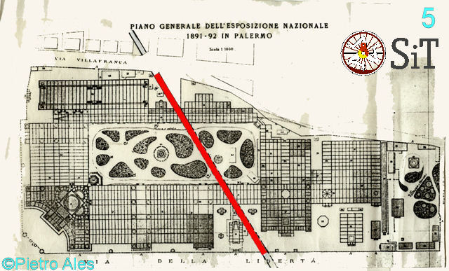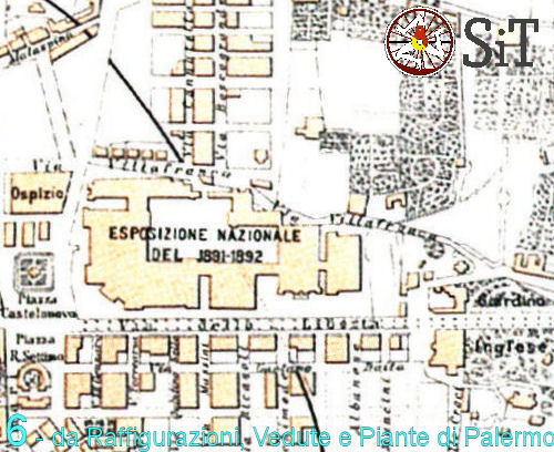 L’inizio della espansione urbanistica che si sviluppò nella zona in esame, oggetto di varie proposte di lottizzazione da parte dei proprietari di quelle aree, fu segnato dalla Esposizione Nazionale che si tenne a Palermo tra il 1891 ed il 1892. Infatti, l’area espositiva venne impiantata proprio nella zona compresa tra piazza Politeama e piazza Croci a monte della via Libertà. La trincea ferroviaria quindi tagliava l’area dell’Esposizione Nazionale, come evidenziato in figura 5 (gentilmente concessa da Pietro Ales). La stessa area è rappresentata (figura 6(3)) nella pianta di Palermo del 1893 edita a Torino dalla Unione Tipografica (da C. Barbera Azzarello – Raffigurazioni, Vedute e Piante di Palermo – Lussografica).