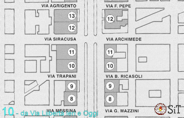 Gli edifici moderni, furono costruiti nel 1969 (angolo via Trapani al posto del Villino Planeta) e nel 1970 (angolo via Siracusa nel sito della Palazzina Riccobono – Miccichè). A valle di via Libertà già nel 1961 il Villino Sillitti fu sostituito dall’edificio moderno all’angolo con la via Archimede mentre è tuttora presente il Palazzo Savona. Si noti come l’area tra questo edificio superstite e i marciapiedi di via Libertà e via Archimede risulti tuttora a quota ribassata. Ultima labile traccia dell’attraversamento ferroviario di via Libertà.