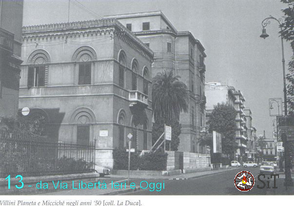 Ancora dal libro di Chirco – Di Liberto(2) si ricavano tre immagini, prese nel primo dopoguerra, del Villino Planeta (figura 11(2)) e della Palazzina Riccobono nella sua configurazione originaria (figura 12(2) a sinistra il prospetto sulla via Libetà) e in quella con le successive sopraelevazioni del nuovi proprietari Miccichè (figura 13(2) – coll. La Duca). Infine, nella immagine di figura 14(2) (foto Scafidi) è ripreso l’incrocio tra via Libertà e via Siracusa con a destra, in vista parziale in primo piano, la Palazzina Riccobono – Miccichè.
