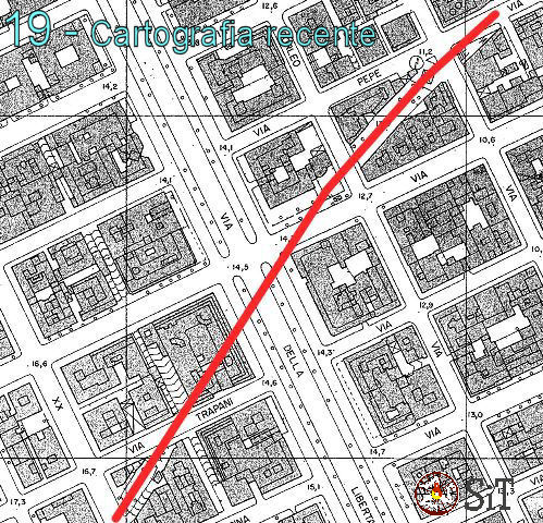 Nella stralcio in figura 8(1) della Pianta della Città di Palermo pubblicata nel 1900 in occasione della Conferenza Europea degli Orari dei Treni le due lottizzazioni sono rappresentate come già realizzate per la maggior parte ed il tracciato ferroviario è segnato in tratteggio, per evidenziare l’avvenuta copertura della originaria trincea. In questa carta notiamo però che mentre risulta corretta la indicazione della trasformazione della trincea originaria a valle della via Libertà in galleria artificiale sino allo sbocco a cielo aperto appena oltre l’attuale via Simone Corleo, appare errata l’estensione del tratteggio verso Palermo Centrale oltre via Trapani, dato che tale tratto rimase ancora prevalentemente in trincea a cielo aperto sino alla chiusura della linea, a meno dei cavalcavia delle varie strade intersecate: via Trapani, via XX Settembre, via Messina, via Nicolò Garzilli, via Enrico Parisi, via Villafranca, via Giuseppe De Spuches, via Sammartino, ecc..
