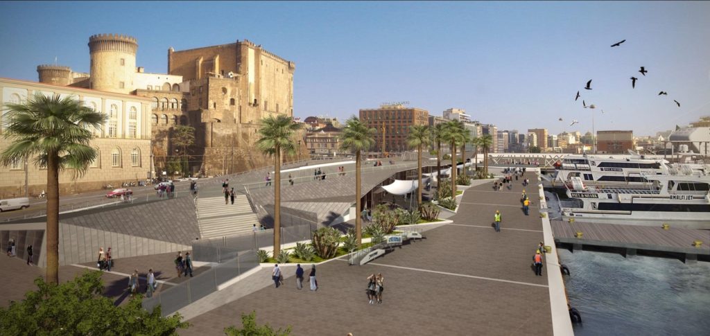 - creazione di un nuovo lungomare pubblico, in continuità con la piazza della Stazione Marittima, utilizzando la copertura del terminal come un percorso attrezzato ed un affaccio verso il mare e verso il Maschio Angioino;