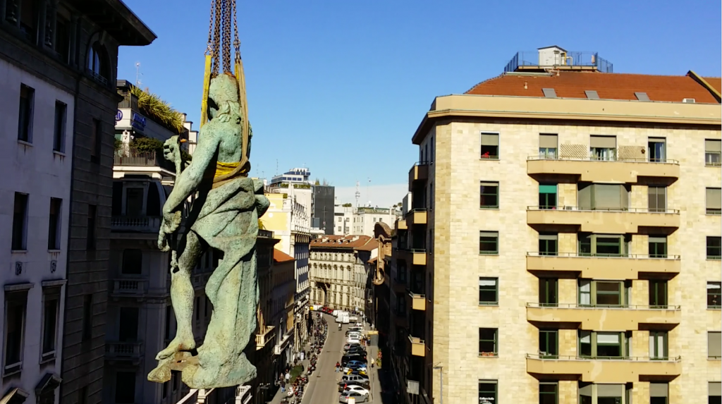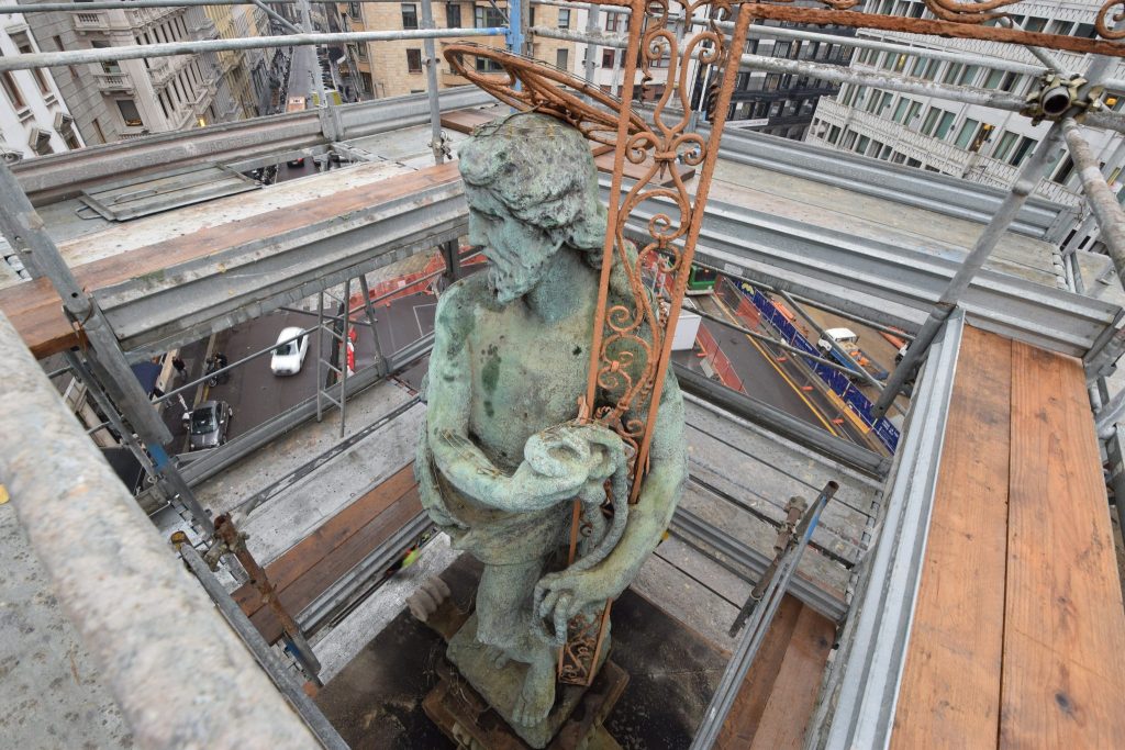 Il muro appartenente al ponte sull’antico Naviglio di San Girolamo è stato smontato e al termine dei lavori sarà ricollocato all’interno della stazione. Sorte analoga tocca alla colonna del Verziere, temporaneamente spostata dal cantiere per il manufatto Augusto insieme alla statua del Redentore che la coronava.
