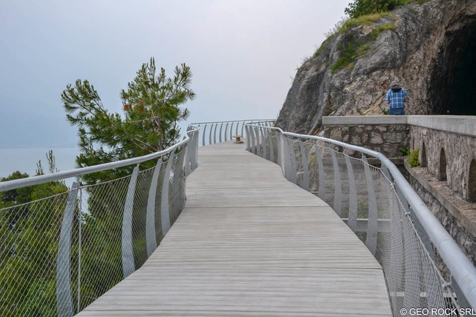Nell’ottica di limitare i disagi derivanti dal cantiere, si è implementato un sistema costruttivo che prevedeva di realizzare la passerella a sbalzo con un impalcato pre-assemblato in officina, in moduli di m 6.00 ciascuno, che hanno garantito tempi di posa estremamente limitati. La struttura portante principale è stata realizzata a “doppio cavalletto”, permettendo ottimi risultati in termini paesaggistici, in quanto si inserita in modo puntuale sulla falesia.