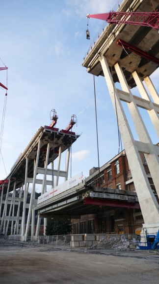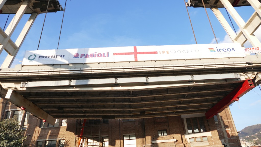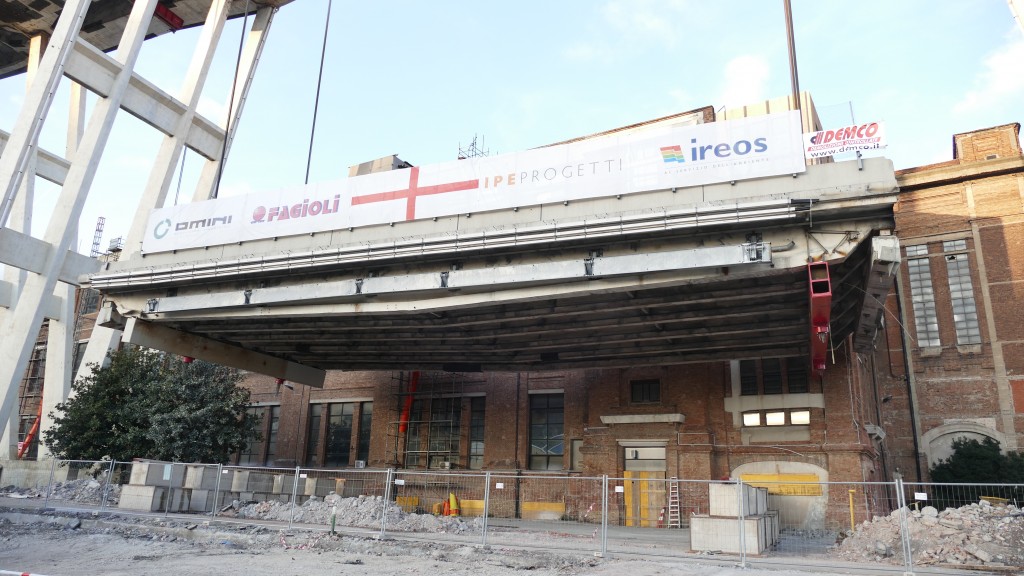 L’impalcato del peso di 850 tonnellate, in quanto alleggerito della parte di struttura interferente con il fabbricato Ansaldo, misurava 36 metri di lunghezza e 18 metri di larghezza ed è stato abbassato con precisione a pochi centimetri dal fabbricato dello stabilimento.