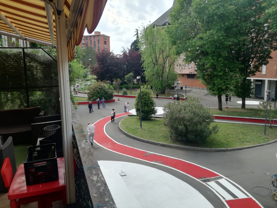 Il colore grigio ha lasciato posto al rosso fiammante dei percorsi ciclabili e dei giochi per bambini disegnati sull’asfalto.