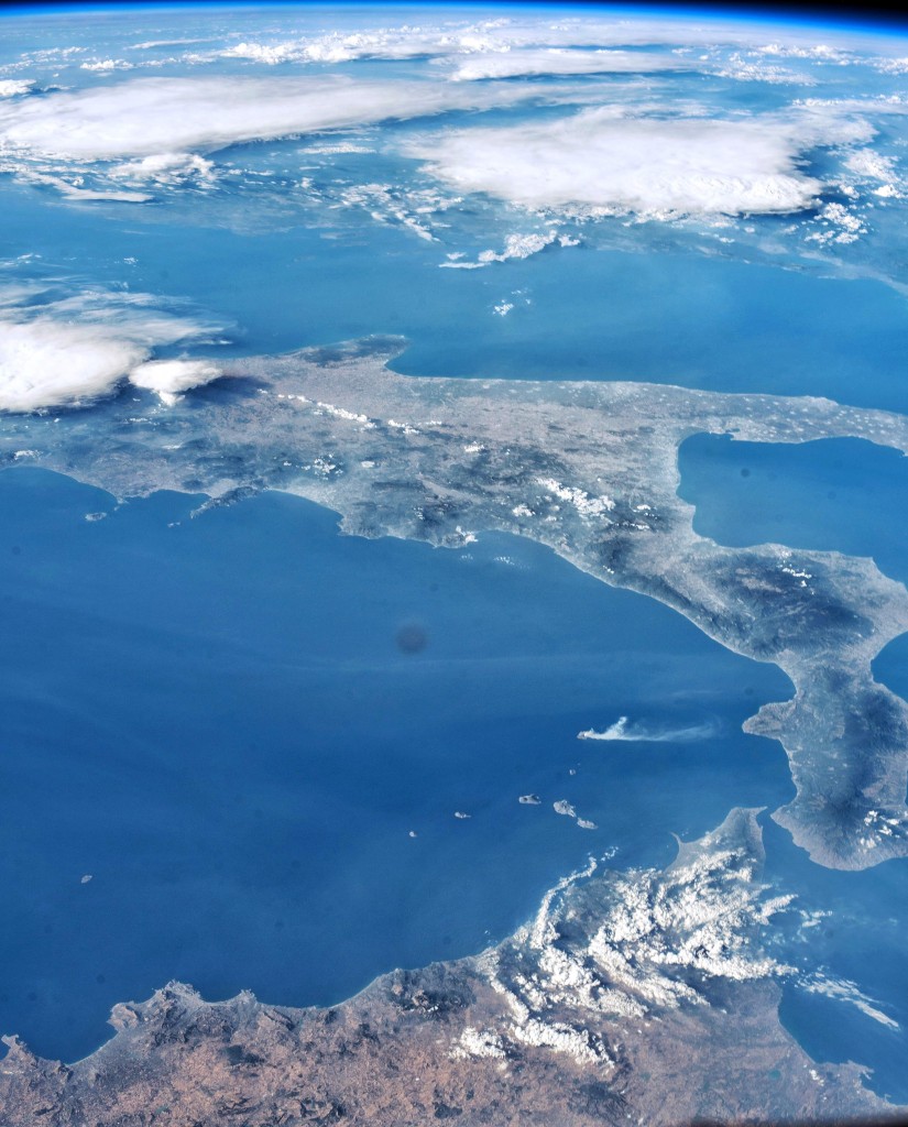 L’Italia dallo spazio si riconosce facilmente: il suo profilo si staglia nel Mediterraneo, la Sicilia e la Sardegna sono inconfondibilii persino a 400 chilometri di distanza a bordo della Stazione Spaziale Internazionale.