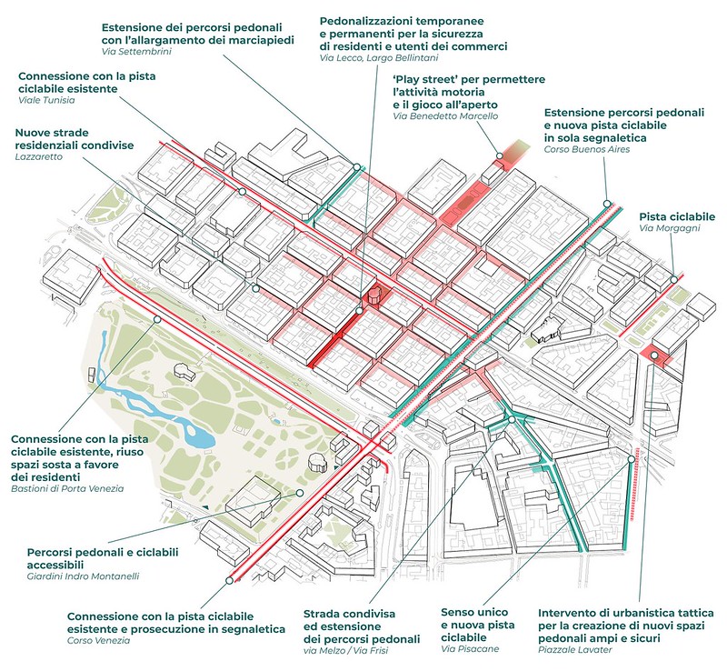 Lazzaretto e Isola saranno i progetti pilota di una città che ripensa i suoi ritmi a partire da quartieri che offrono servizi e qualità della vita entro lo spazio dei 15 minuti a piedi dalla propria abitazione. Attraverso interventi di temporanea pedonalizzazione di alcune strade, allargamento dei marciapiedi, istituzione di zone 30, connessioni con le piste ciclabili esistenti, posa di dehor, si libererà spazio pubblico prezioso da dedicare alla vita all’aperto di grandi e bambini. In particolare, al Lazzaretto saranno temporaneamente pedonalizzate via Lecco, largo Bellintani e via Benedetto Marcello, creando connessioni ciclopedonali con la futura ciclabile di corso Buenos Aires, il percorso lungo i Bastioni e la pista in segnaletica di viale Tunisia. All’Isola il cuore dell’intervento sarà via Toce, che verrà pedonalizzata e trasformata in una playstreet per il gioco dei bambini in connessione con le aree verdi di fronte alla scuola e quelle del giardino Bruno Munari.