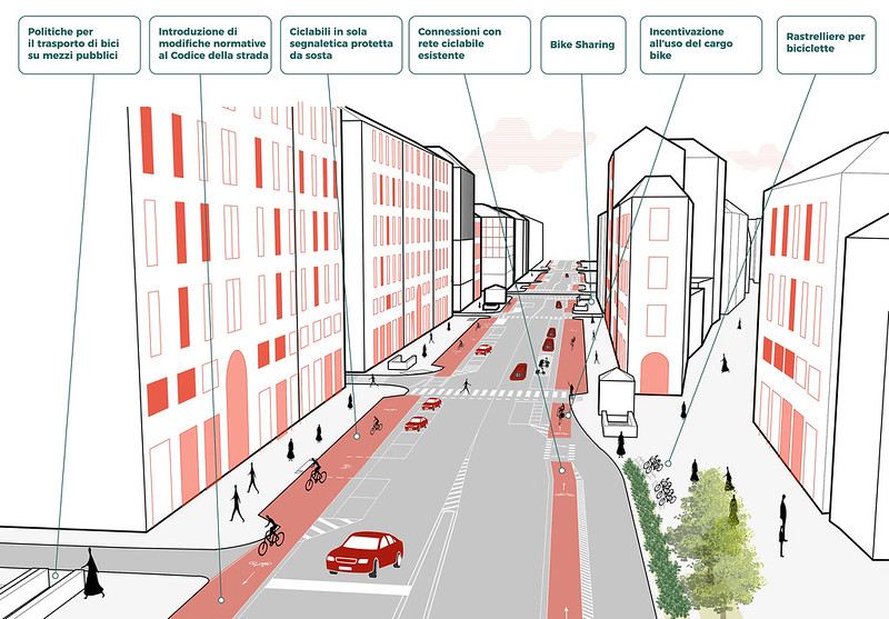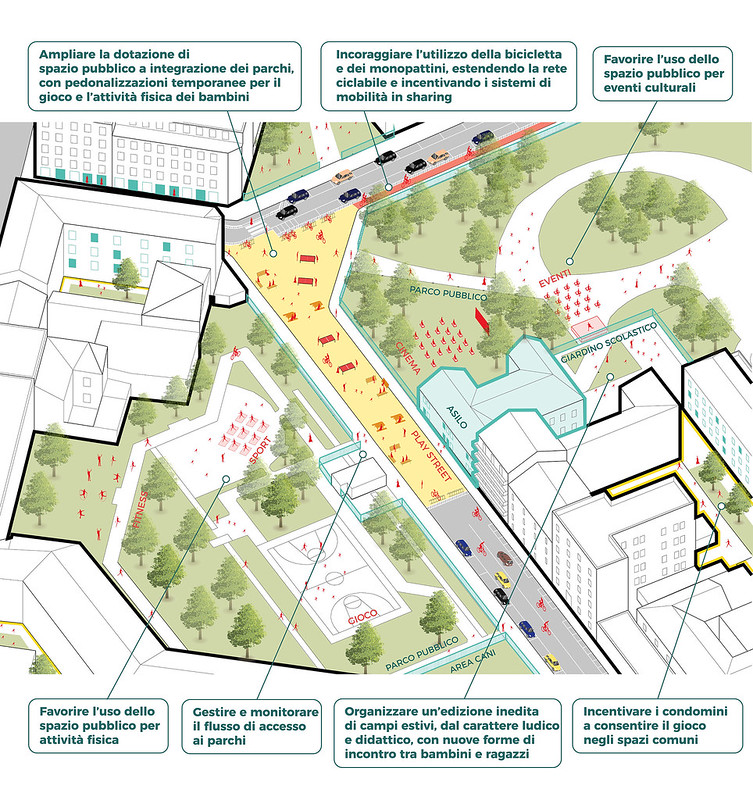 Realizzare nuovi percorsi ciclabili anche in sola segnaletica; incrementare le strade a velocità moderata e le zone 30 e le strade residenziali a prevalente mobilità pedonale e ciclabile; ampliare i percorsi pedonali attraverso l’allargamento di marciapiedi; prevedere pedonalizzazioni temporanee nei quartieri ampliando l’offerta per il gioco e l’attività fisica dei bambini; realizzare nuovi interventi di urbanistica tattica nell’ambito del progetto Piazze Aperte; facilitare la possibilità di posare tavolini per bar e ristoranti sulle aree di sosta ai fini di recuperare parte della capienza persa all’interno per il distanziamento.