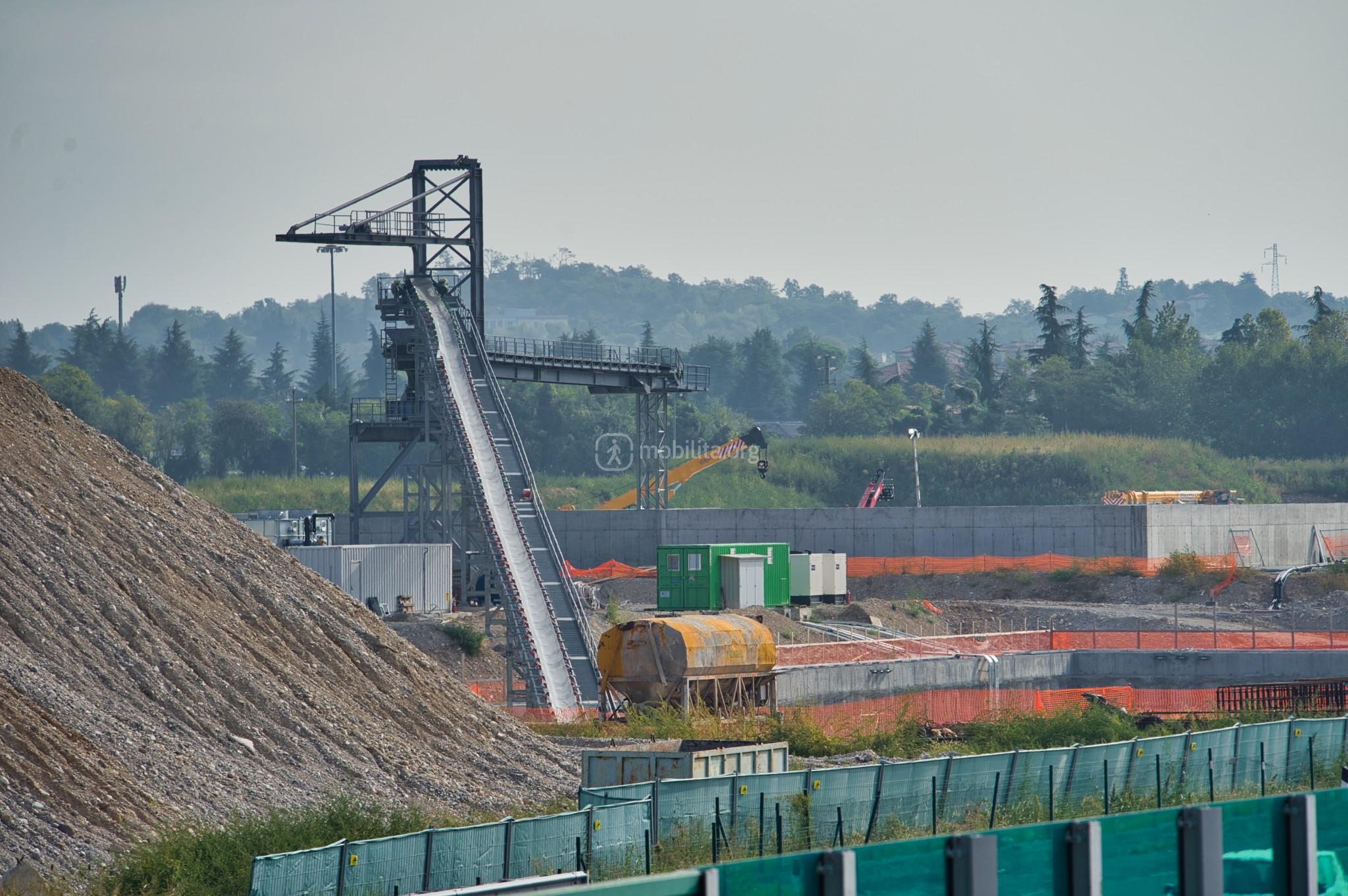 E’ stato inoltre messo in opera il nastro trasportatore che trasporterà lo smarino estratto dallo scavo della galleria direttamente sopra il cantiere per decantare ed essere successivamente portato nelle apposite aree individuate da progetto