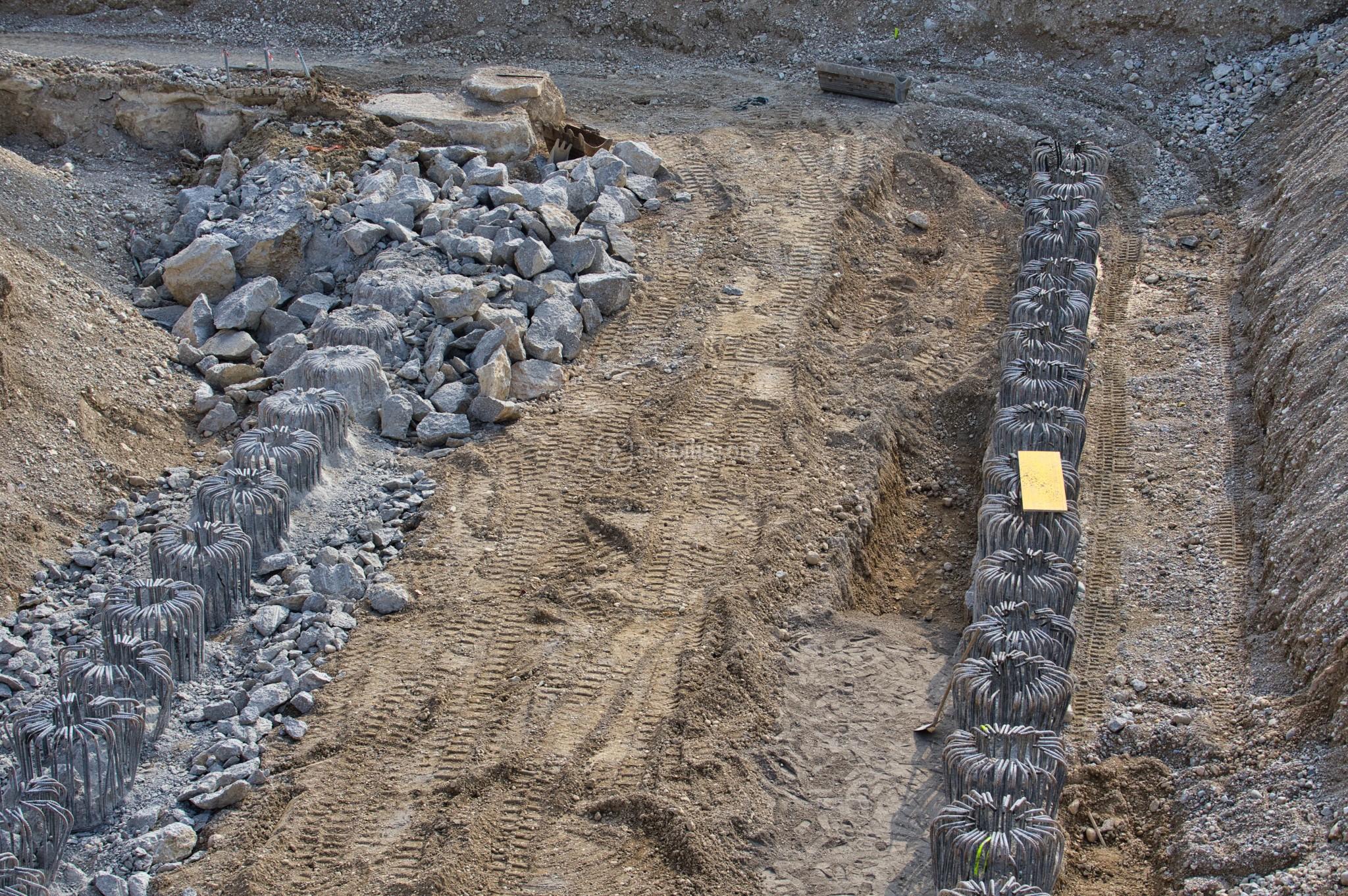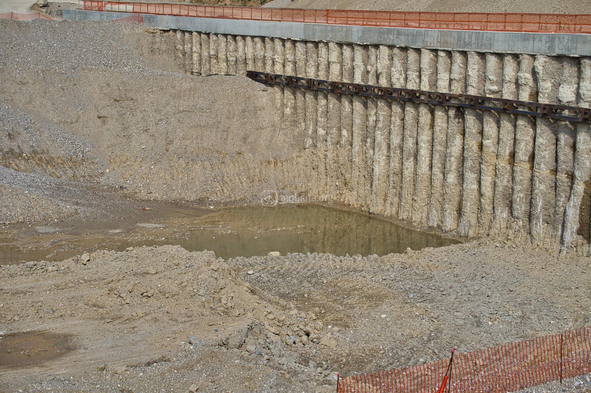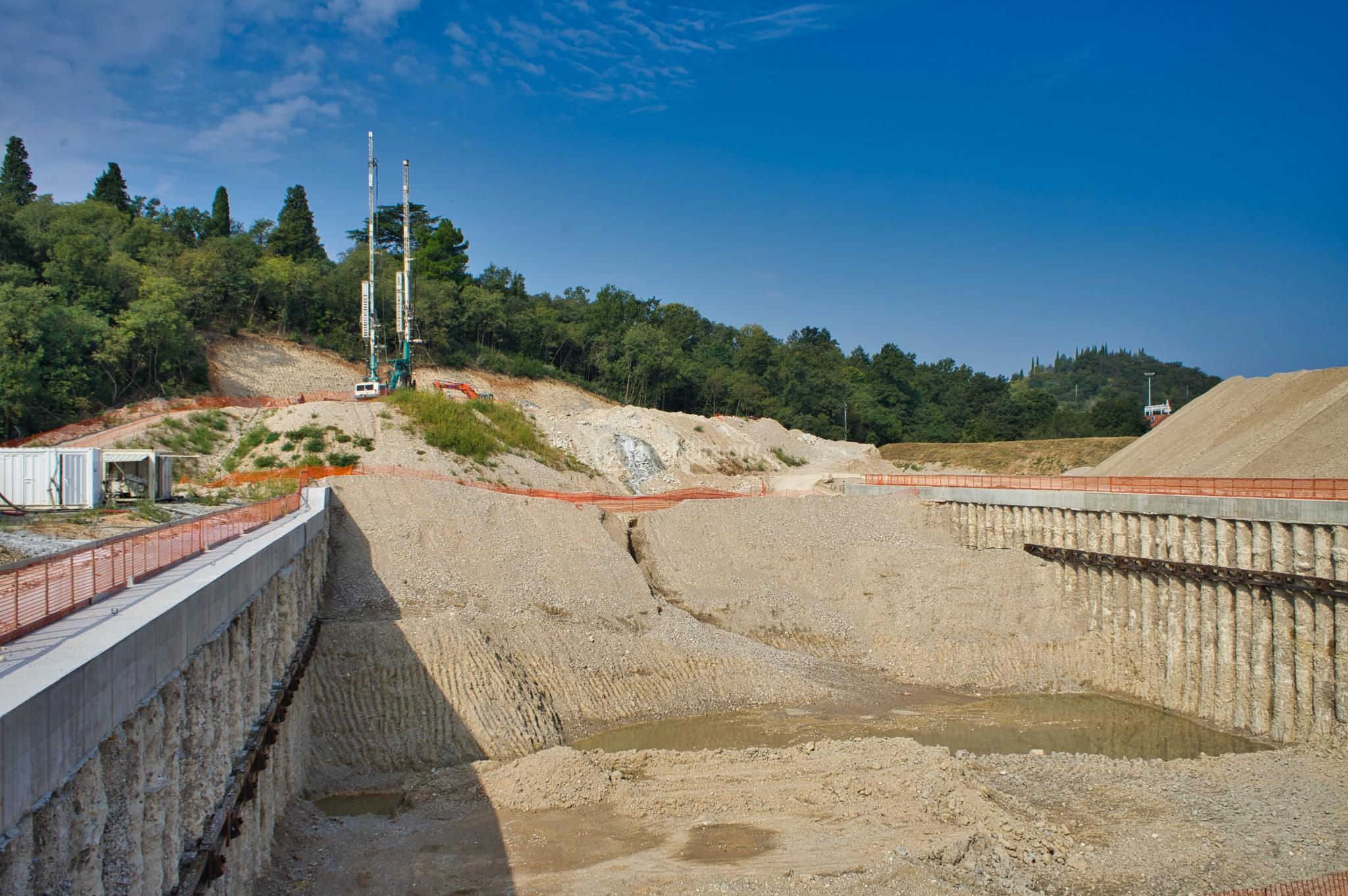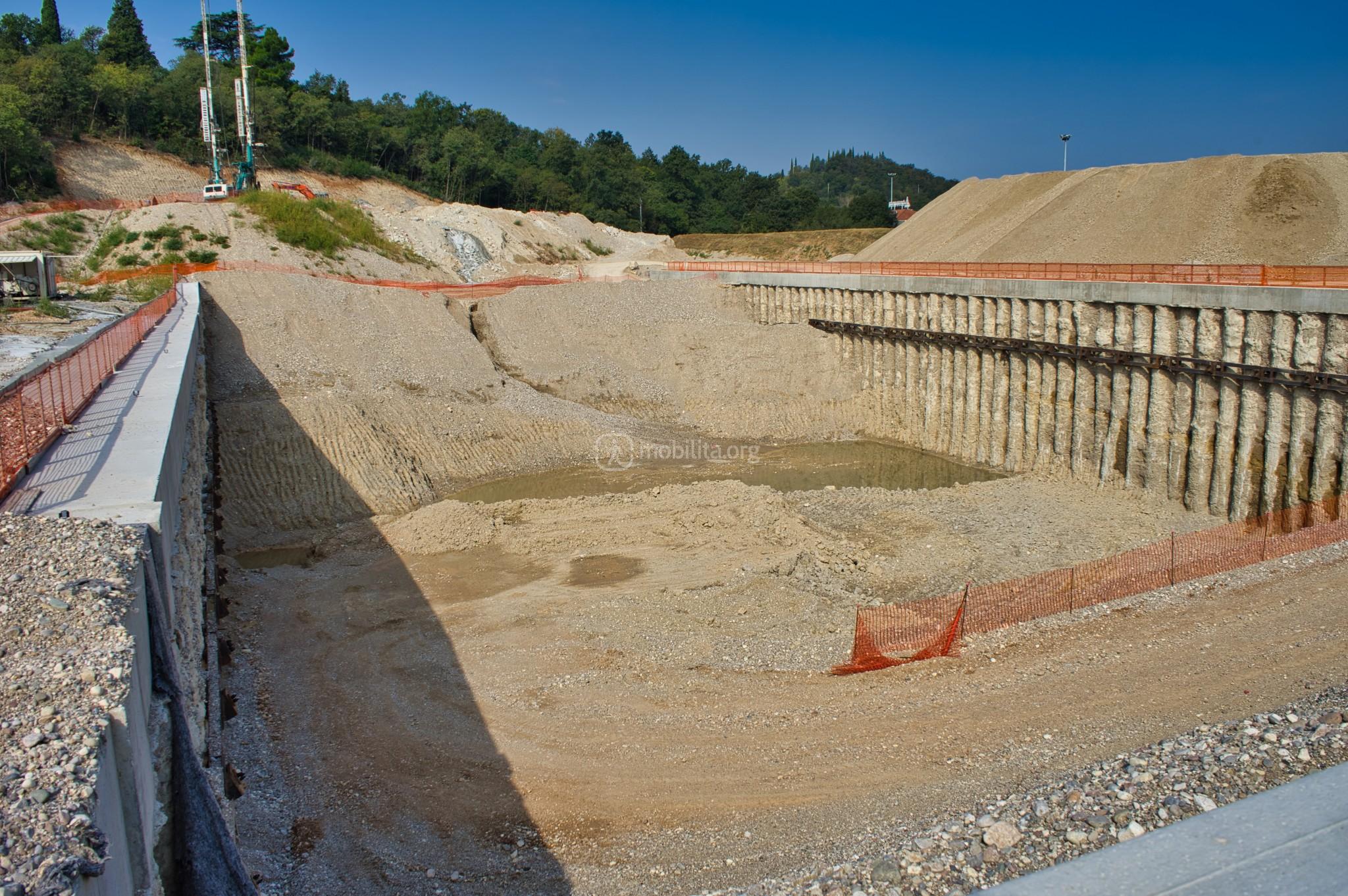 L’area a valle della nuova viabilità vede notevoli progressi. Sono infatti terminati parzialmente i lavori di realizzazione dei pali di fondazione e con l’ausilio di due escavatori si sta iniziando a scavare il proseguo della lunga fossa di estrazione della talpa.