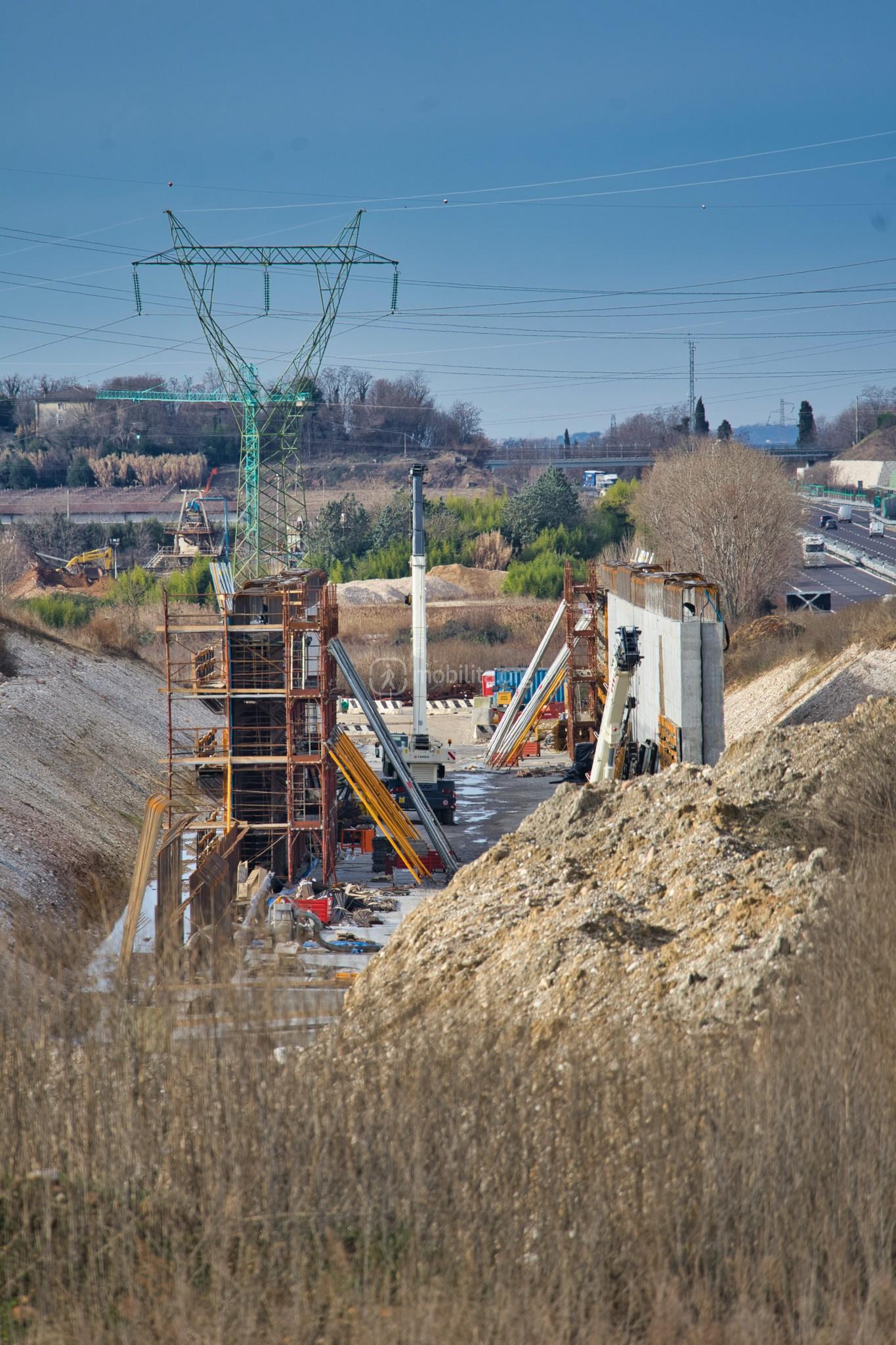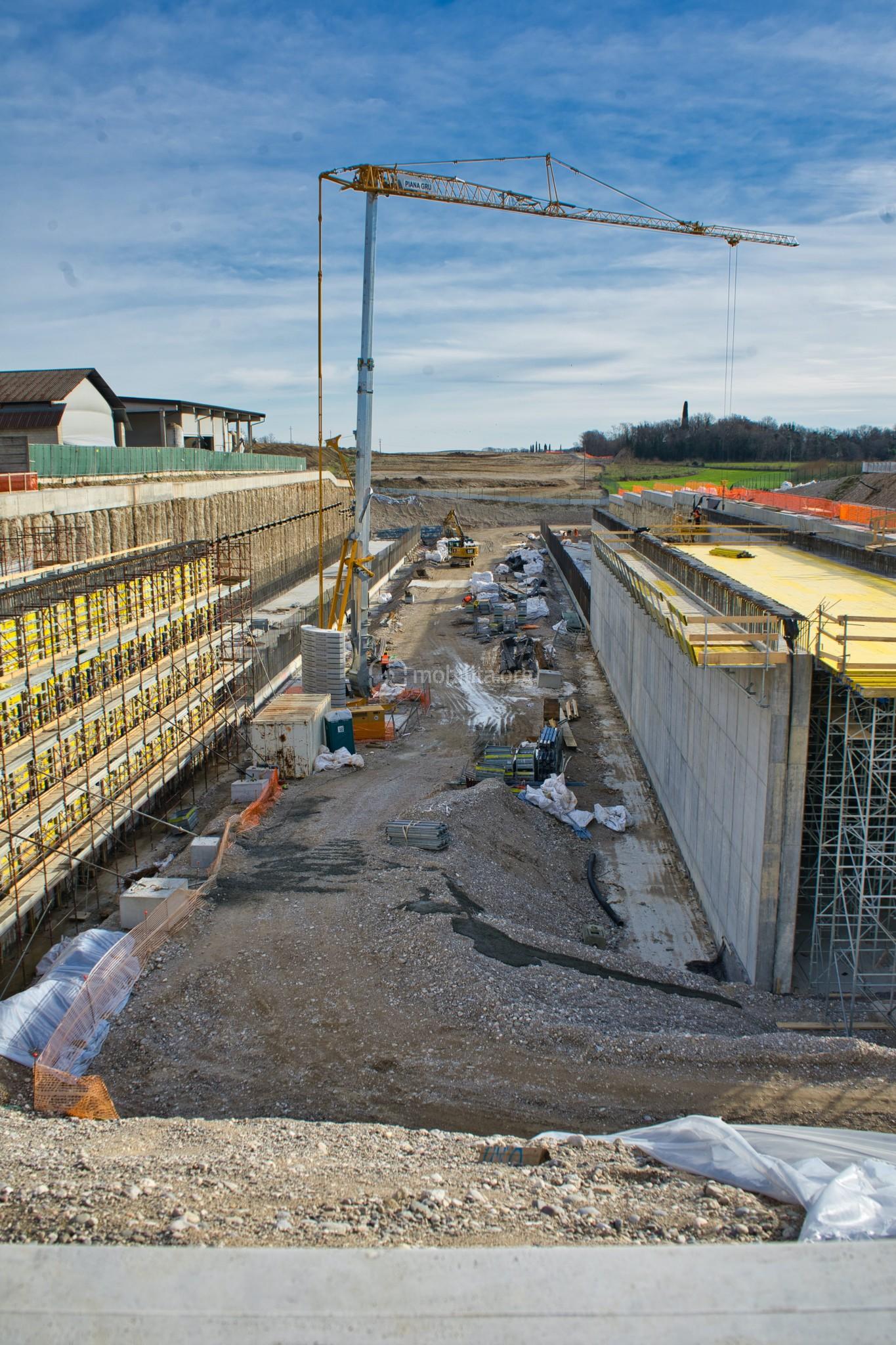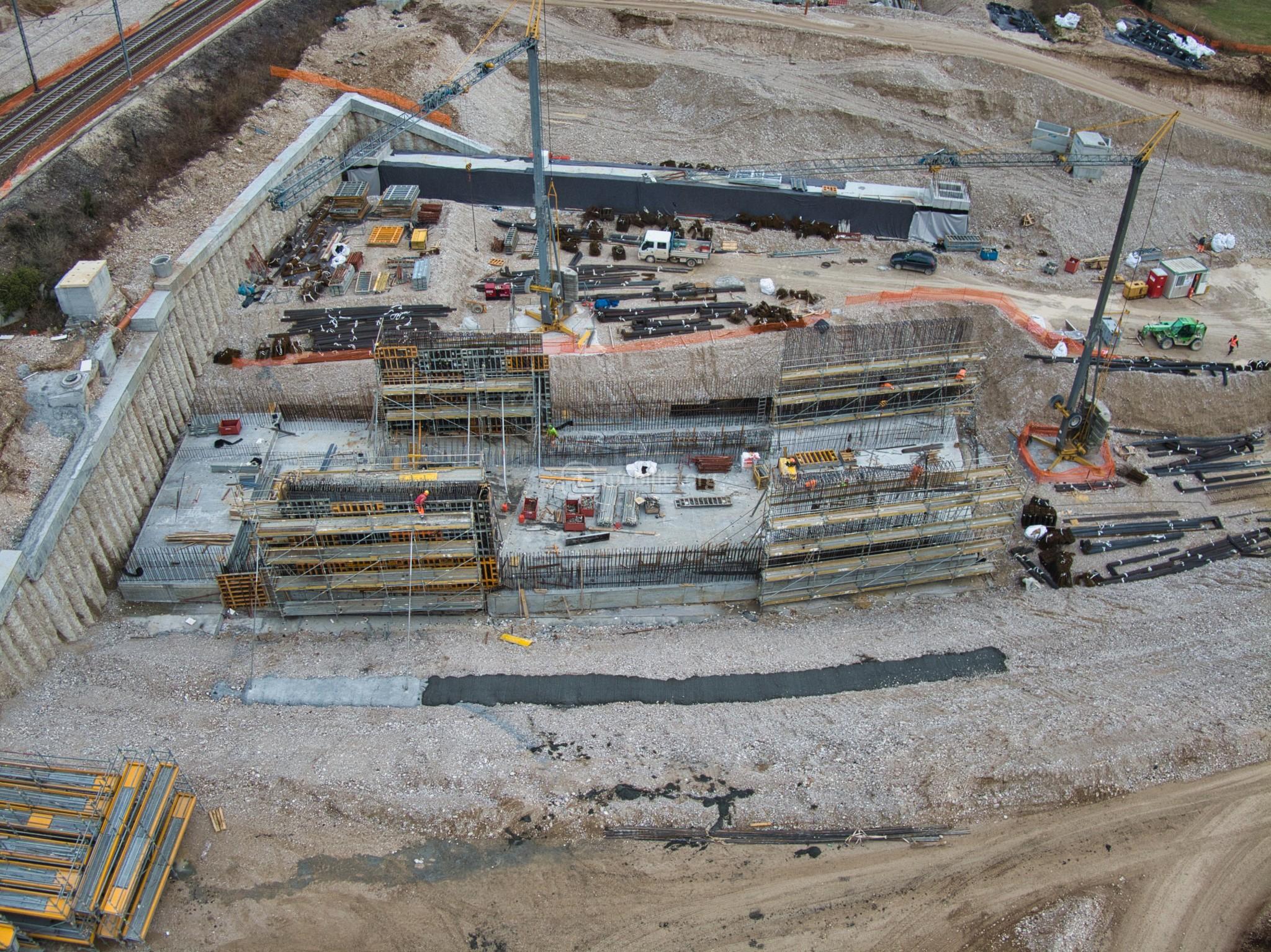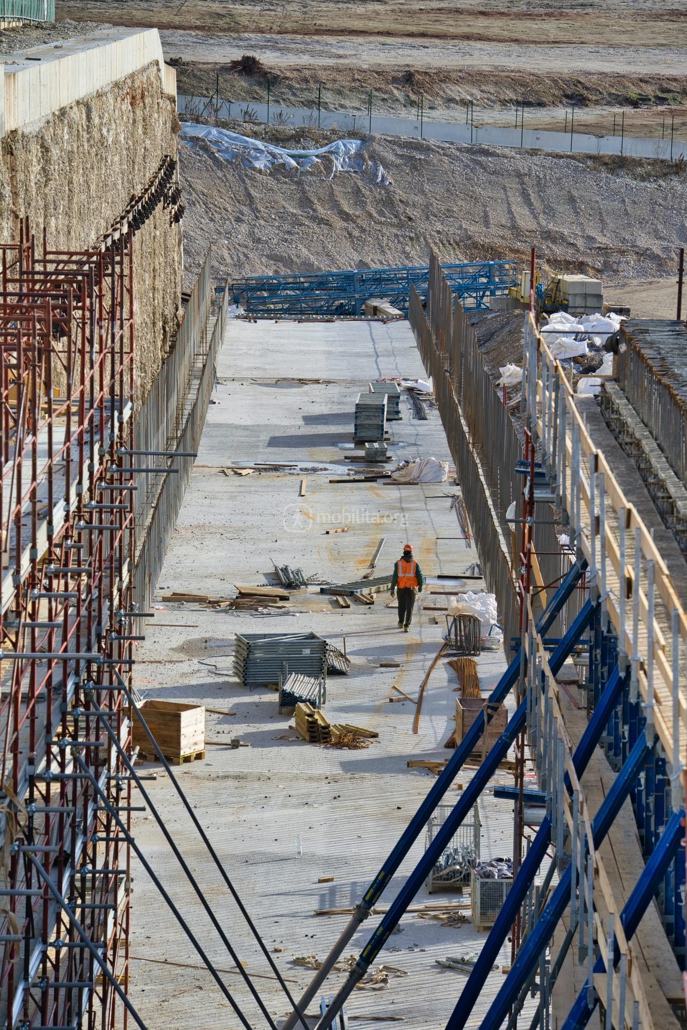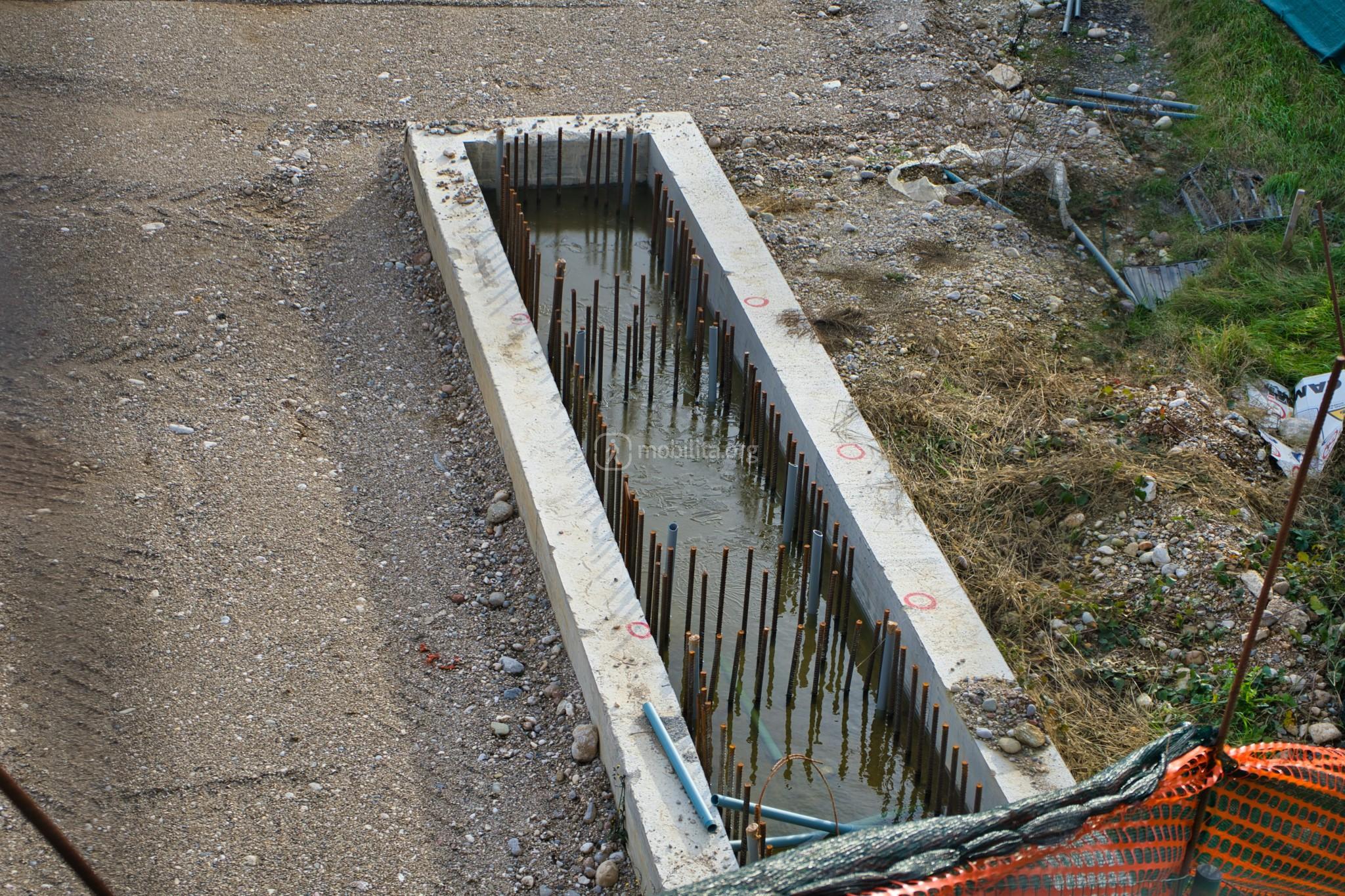 Si stanno ultimando la costruzione del monolite IN77 che verrà spinto sotto la linea storica e la realizzazione dei muri per il tratto di deviazione.