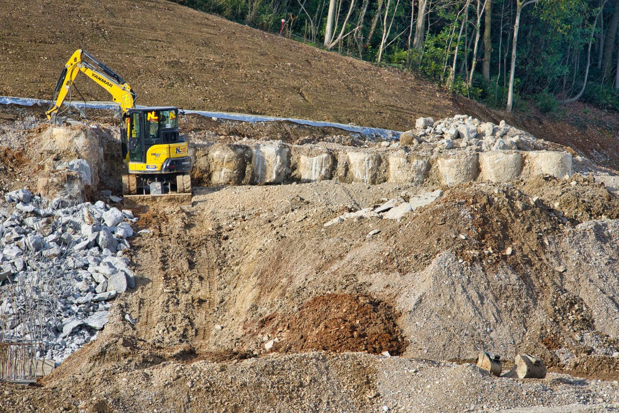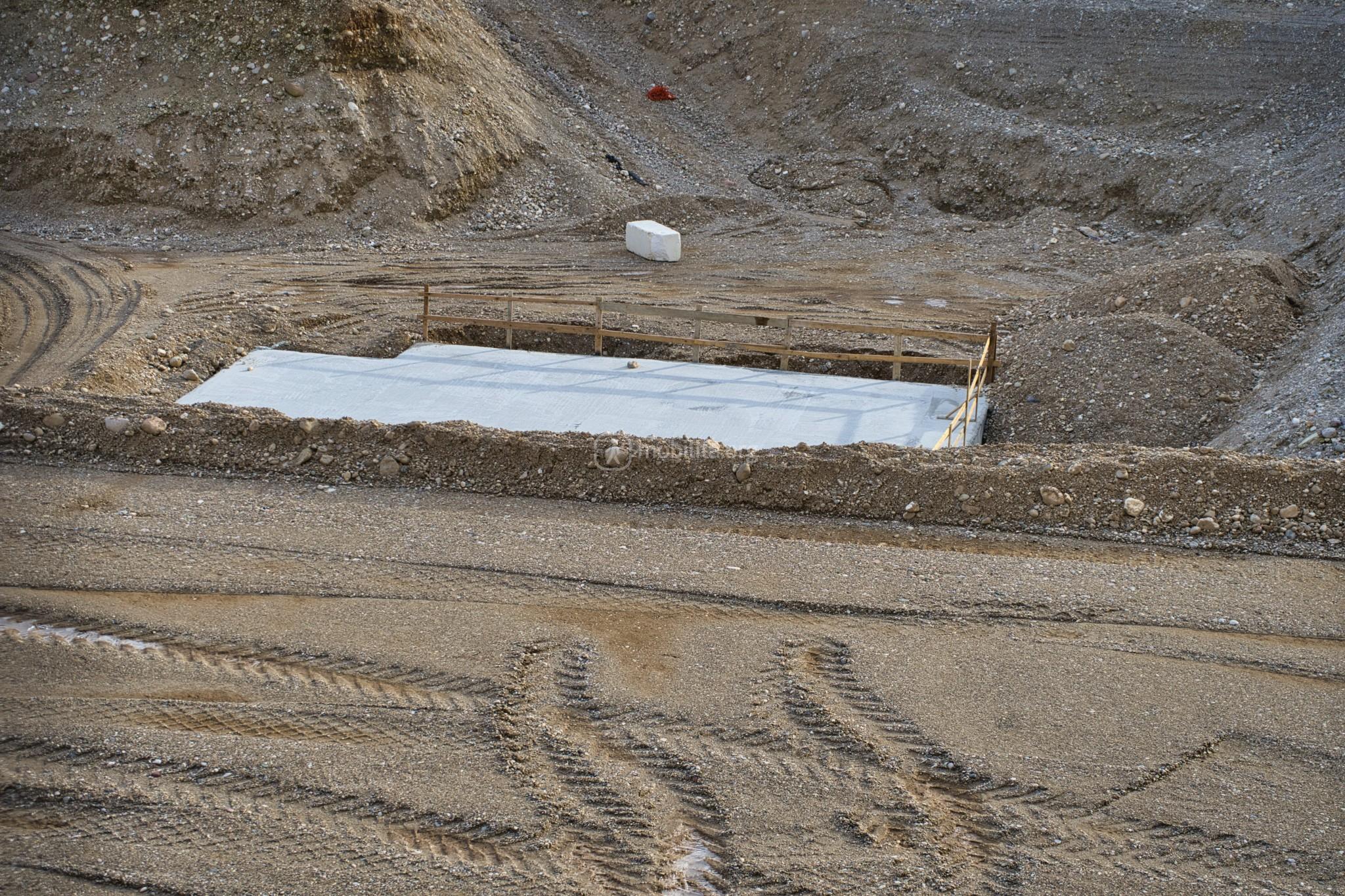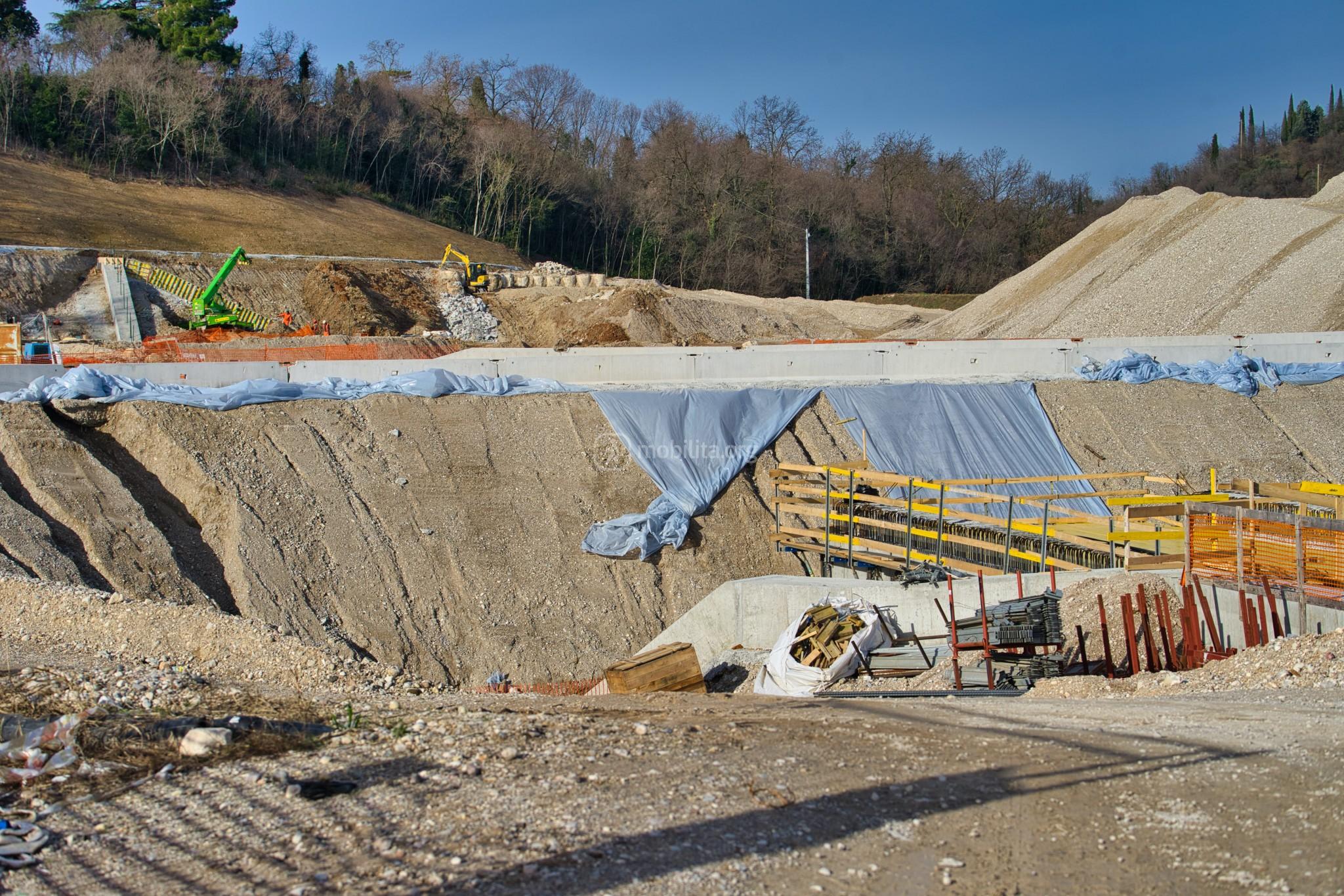 Sia l’area a valle, che a monte della nuova viabilità vede notevoli progressi. Lato monte si sta proseguendo i lavori di realizzazione della fossa di estrazione, in particolare si continua a scavare in profondità e lungo la montagna sembra si stiano realizzando delle opere per la raccolta delle acque