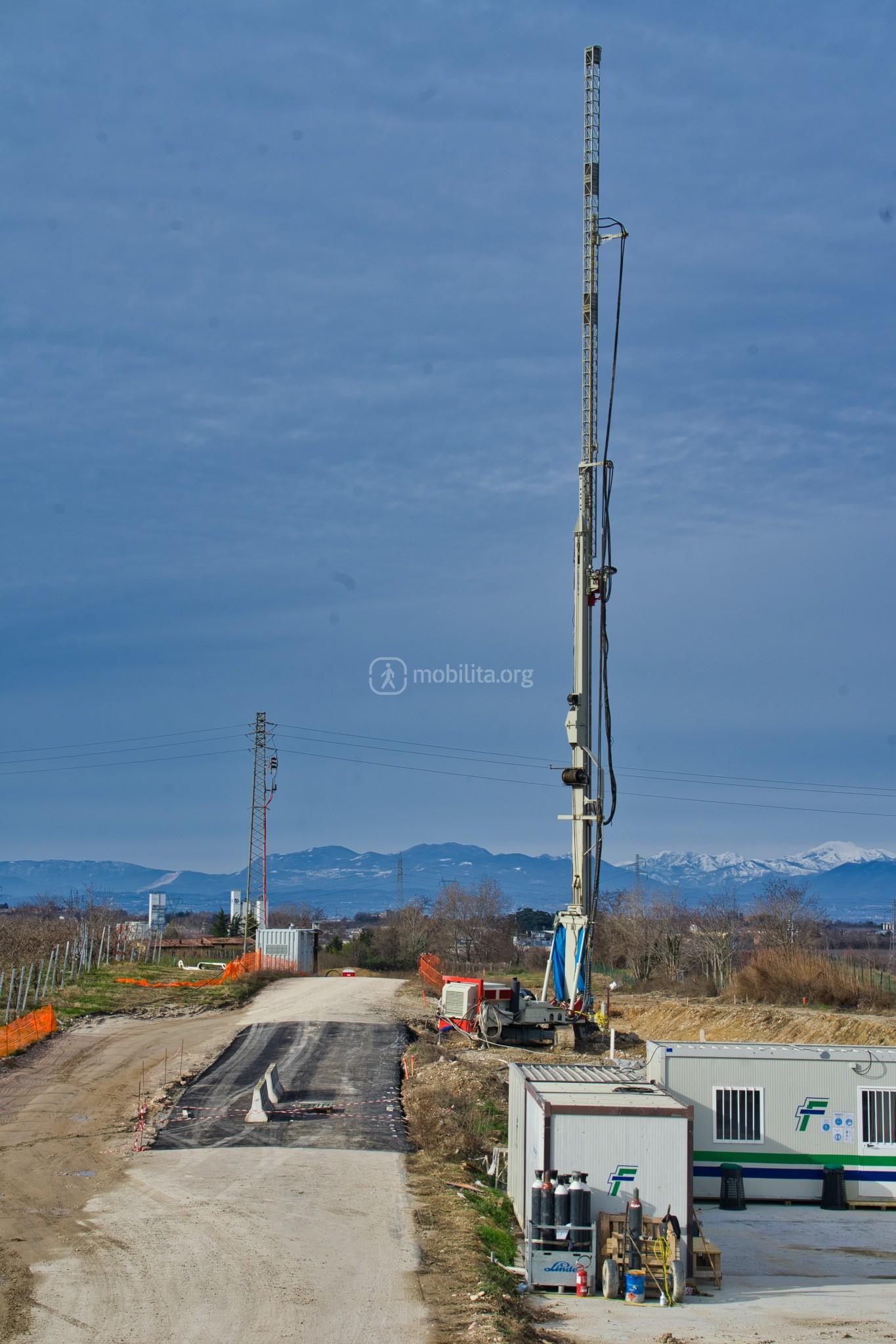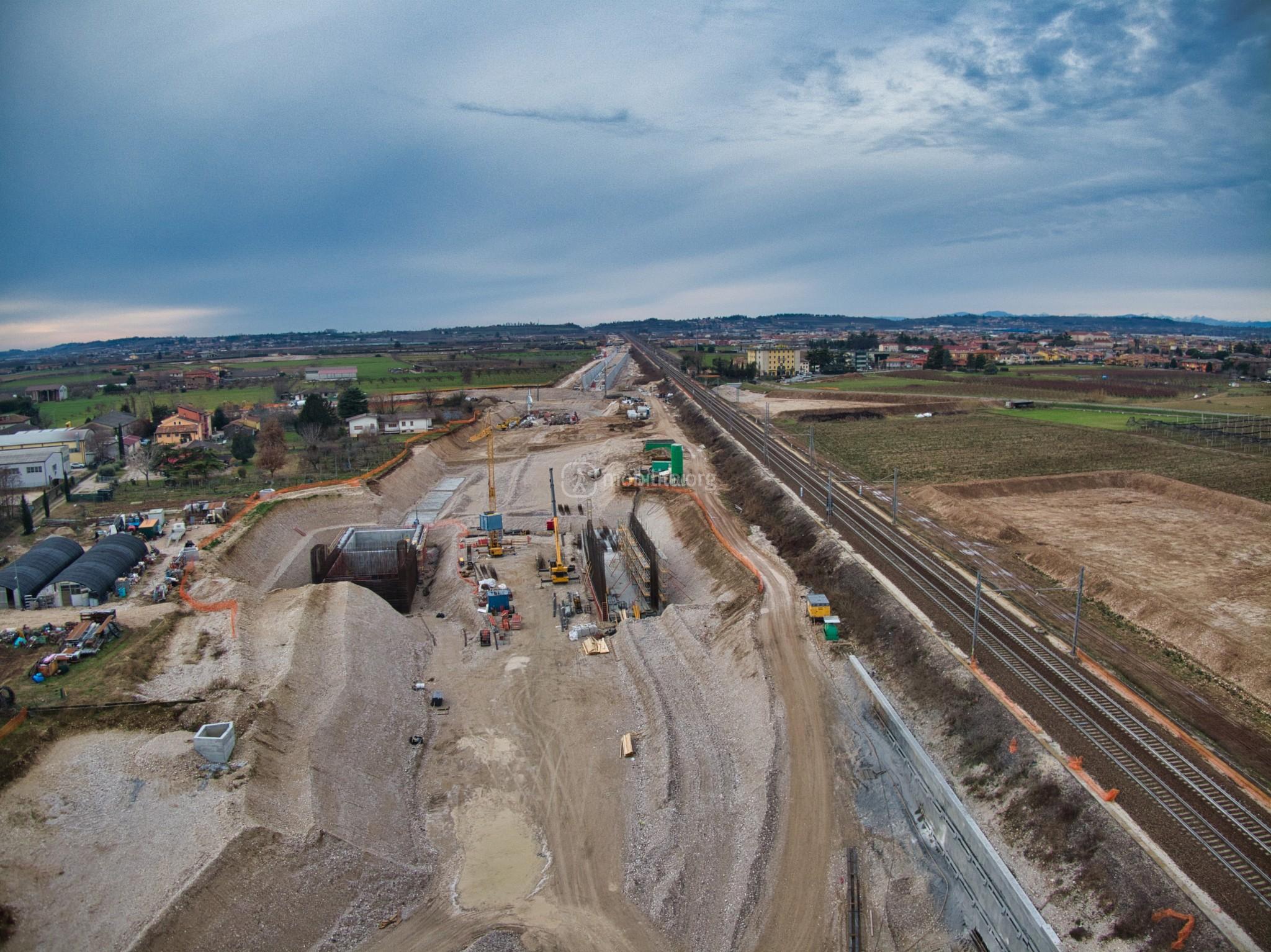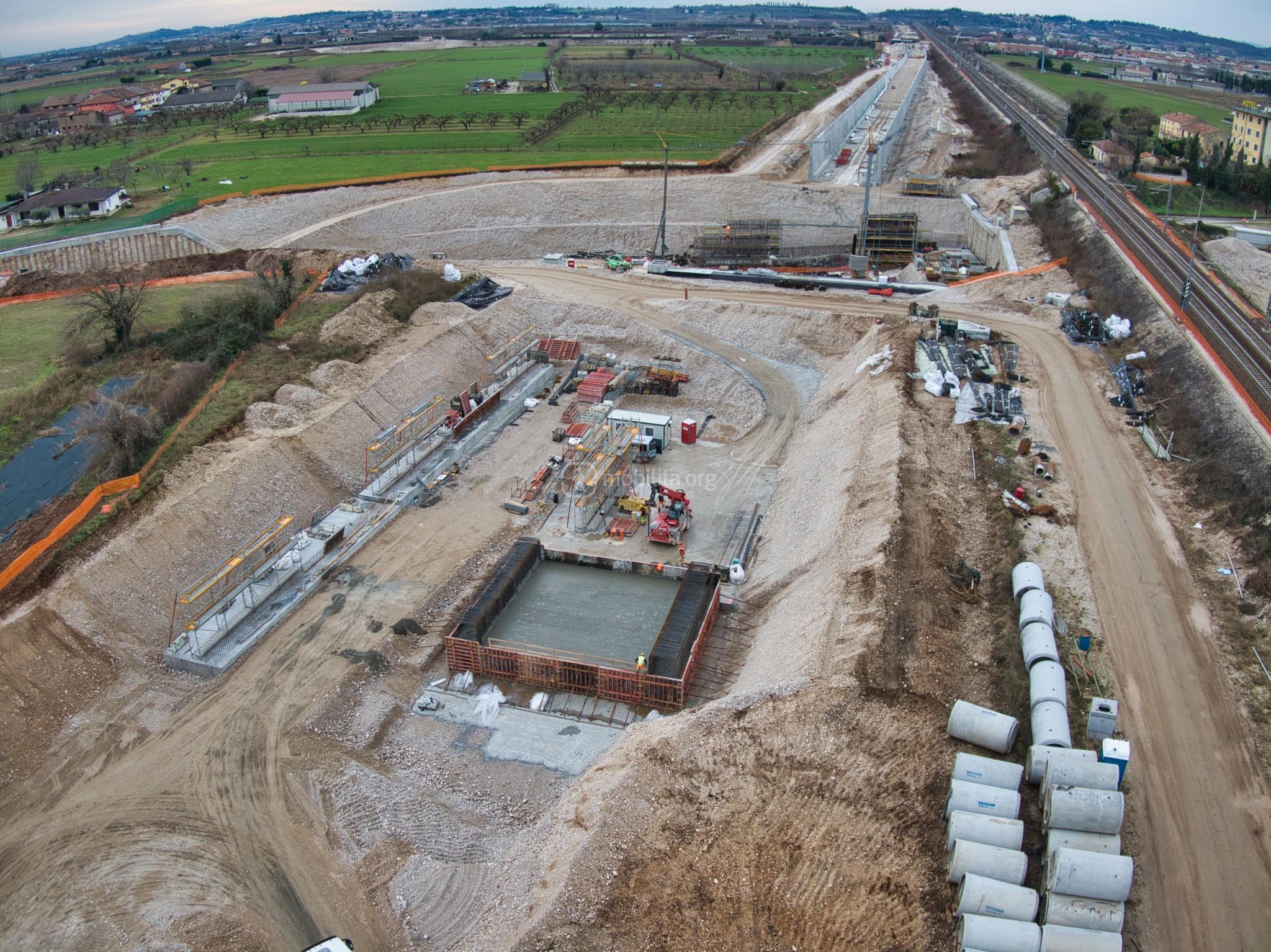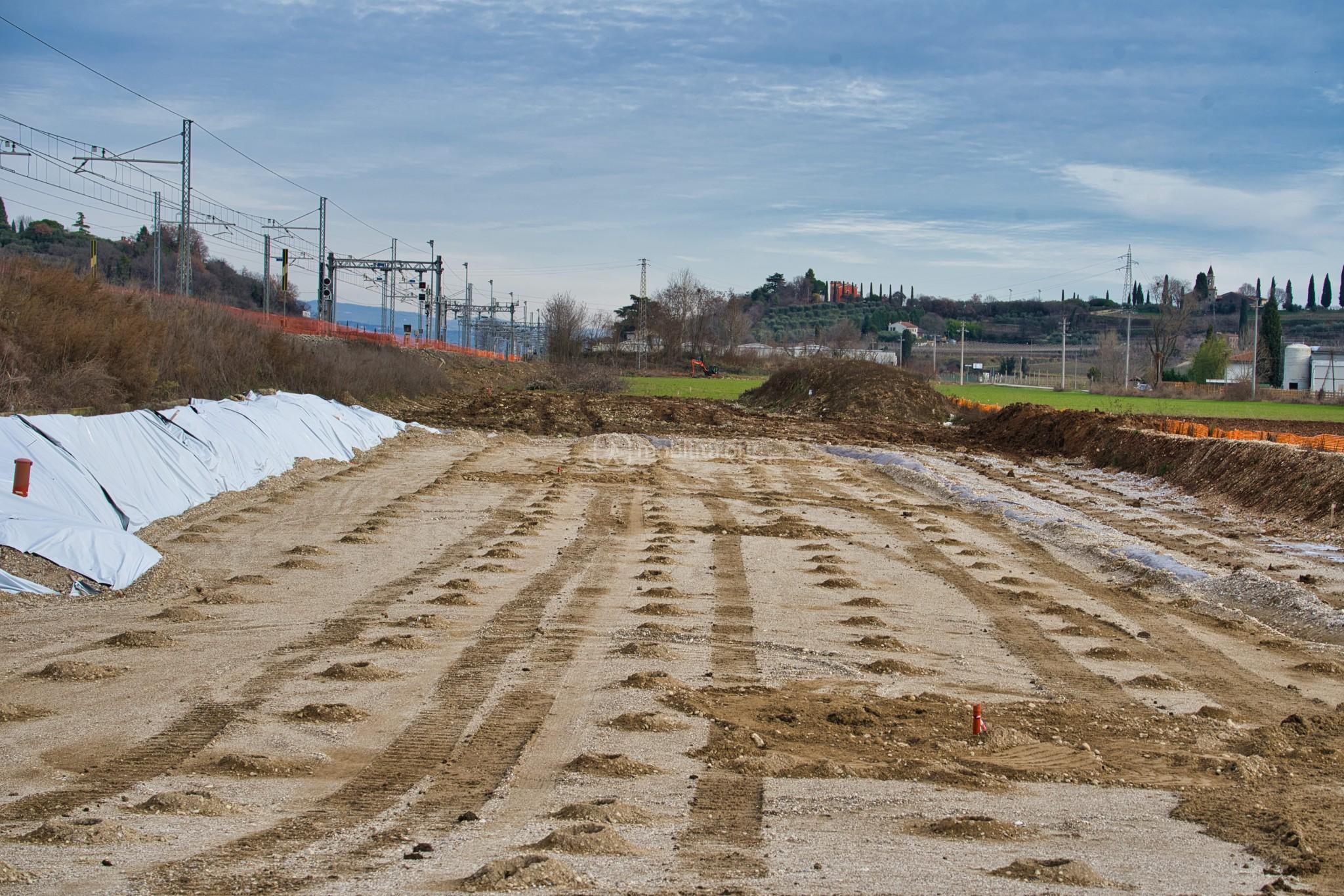 Nel cantiere di Tagliaferro si procede alla costruzione del portale di ingresso della galleria. In direzione Verona si sta procedendo allo spostamento dei cavi di AT e sono iniziati i lavori di palificazione tramite l’utilizzo di due trivelle per la realizzazione della sede ferroviaria.