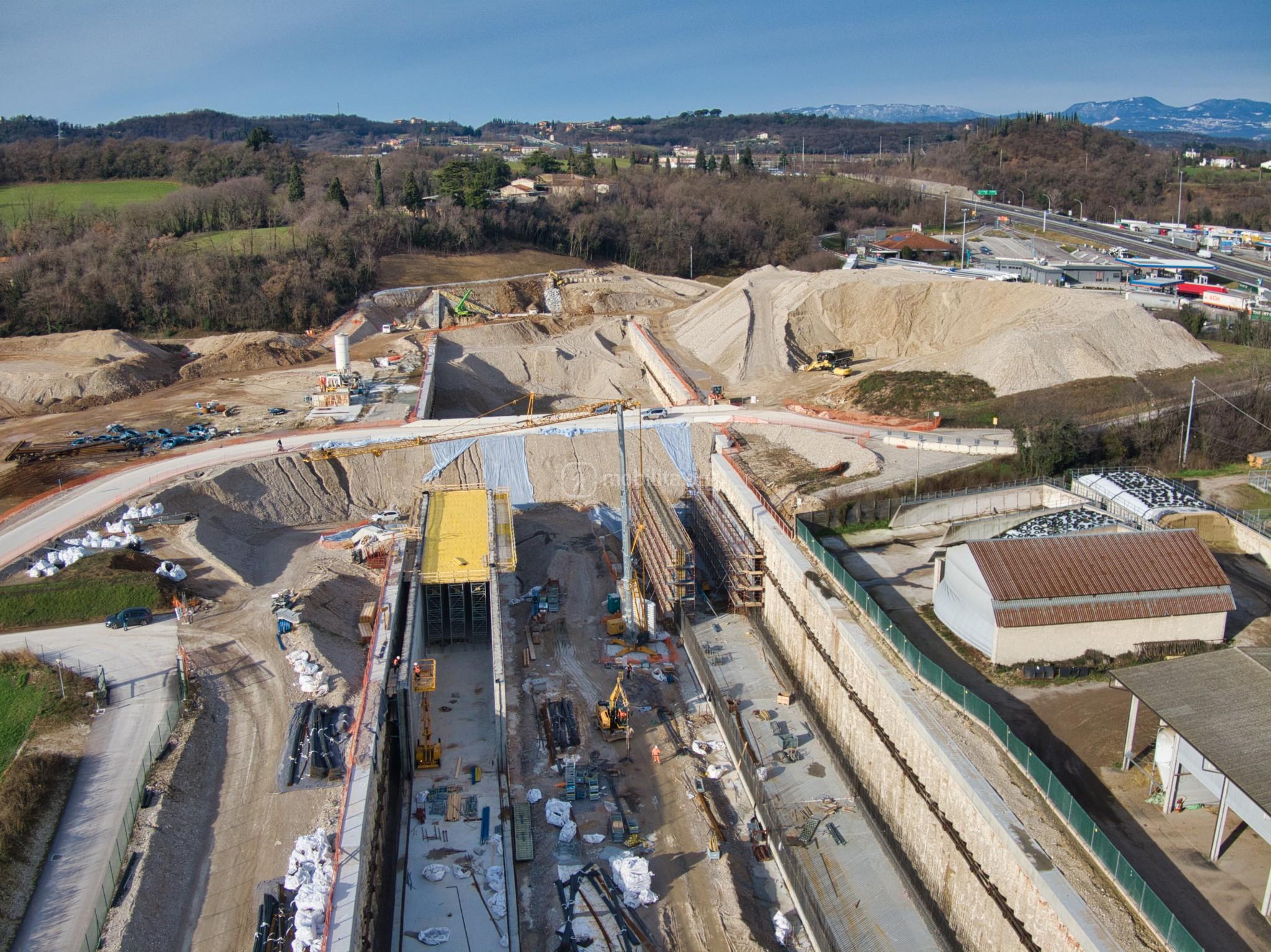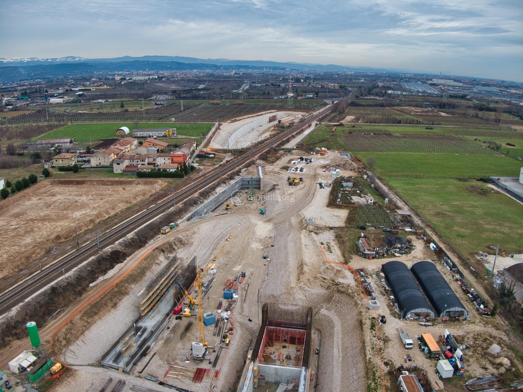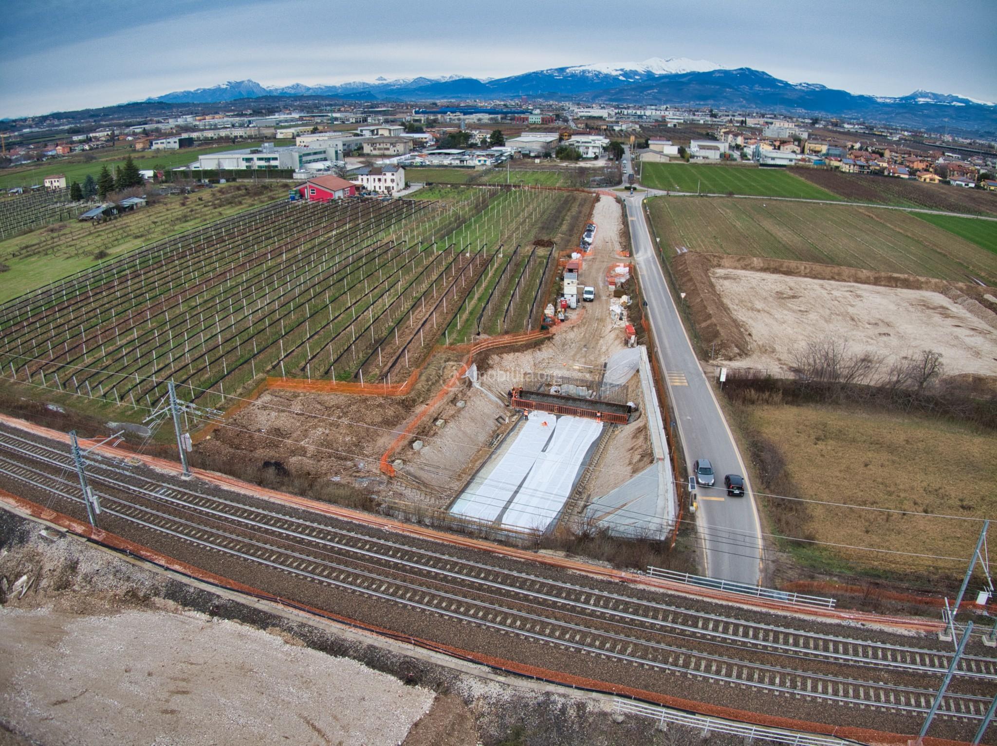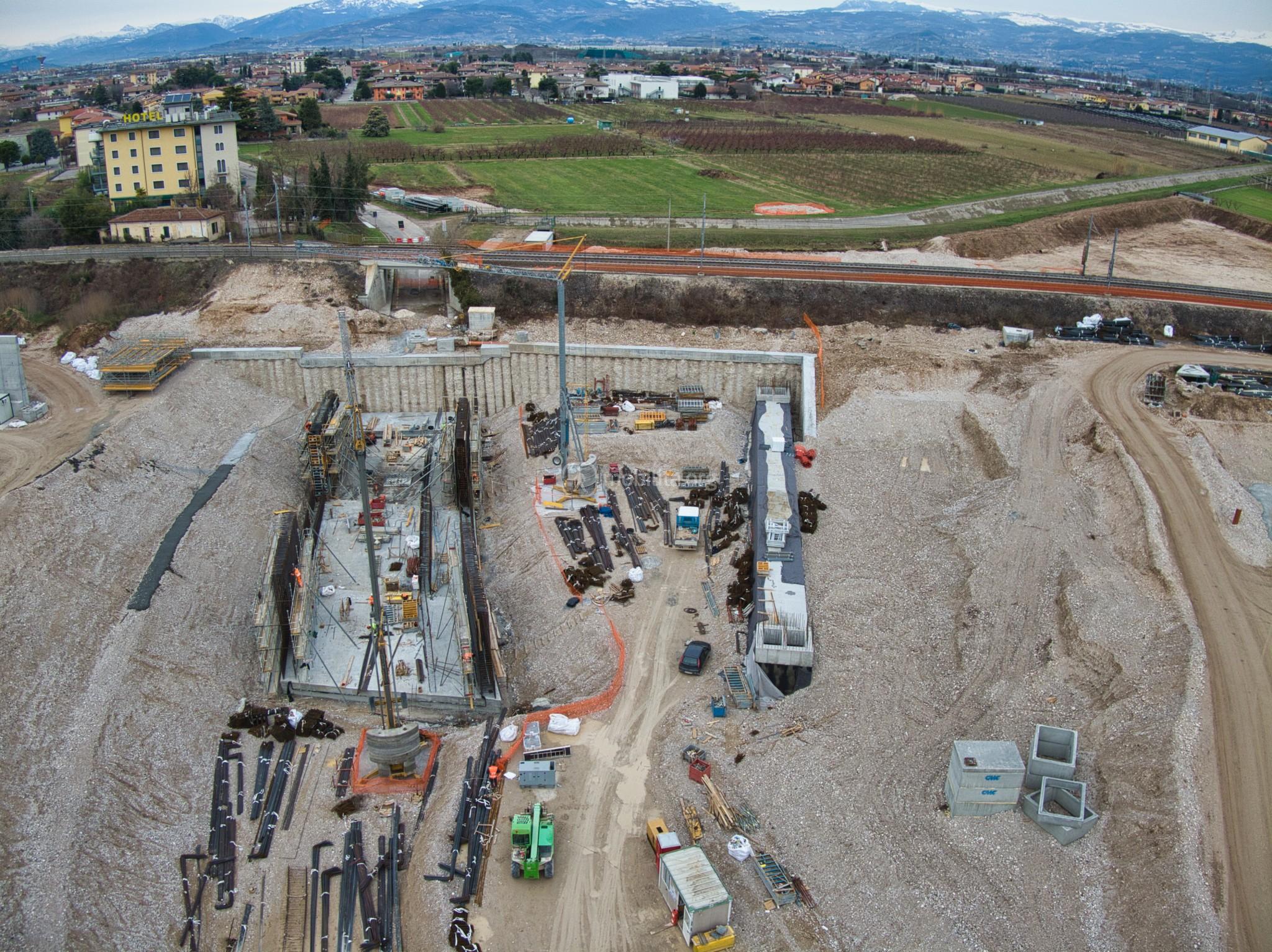 Nel cantiere di Tagliaferro si procede alla costruzione del portale di ingresso della galleria. In direzione Verona si sta procedendo allo spostamento dei cavi di AT e sono iniziati i lavori di palificazione tramite l’utilizzo di due trivelle per la realizzazione della sede ferroviaria.