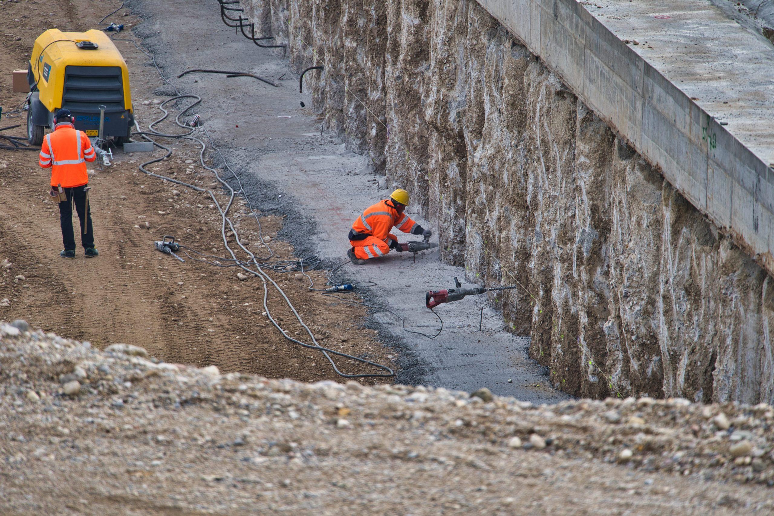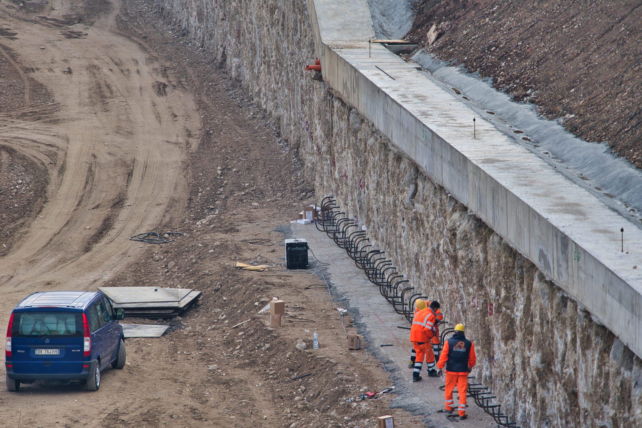 Nella fossa di estrazione si sta realizzando una discenderia in cemento, probabilmente per agevolare l’ingresso e l’uscita dei mezzi e dei pezzi della TBM: