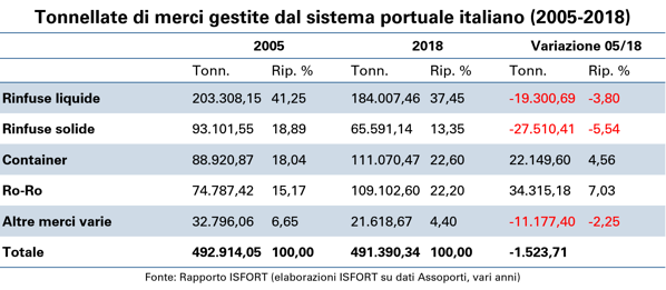 Secondo il Rapporto ISFORT “Riflessioni sul sistema dei trasporti in Italia” del 2018, la metà delle navi approdate nei porti italiani (50,8%) trasportavano rinfuse liquide e solide. Per “rinfuse” si intendono tutte quelle merci come il petrolio o i cereali, che possono essere contenute direttamente nella stiva della nave. Nei containers ha viaggiato il 22,6% del totale delle merci.