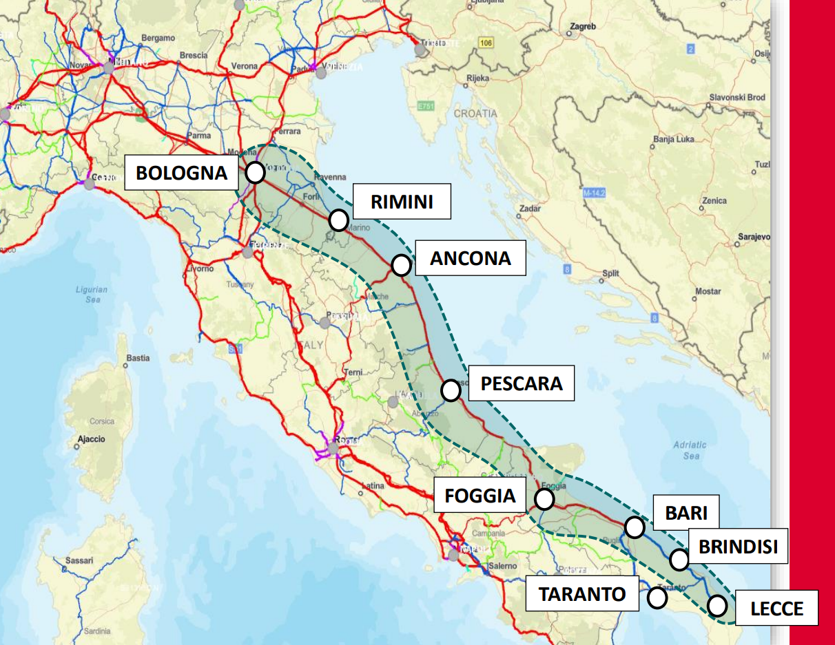 La linea Adriatica fa parte del Corridoio Scandinavo-Mediterraneo della Rete europea TEN-T e costituisce il principale itinerario di collegamento per le merci provenienti dai (o dirette ai) porti del Mezzogiorno (tra cui Gioia Tauro, Taranto, Bari, Brindisi) e dell’Adriatico Centrale (tra cui Ancona, Ortona, Vasto, Termoli). Il Progetto, concordato con le Regioni, è dotato di forte valenza strategica per l’intero Paese e prevede, oltre alla progettazione di fattibilità tecnico-economica degli interventi, anche di lungo periodo, diverse fasi attuative da realizzare nel corso dei prossimi anni.