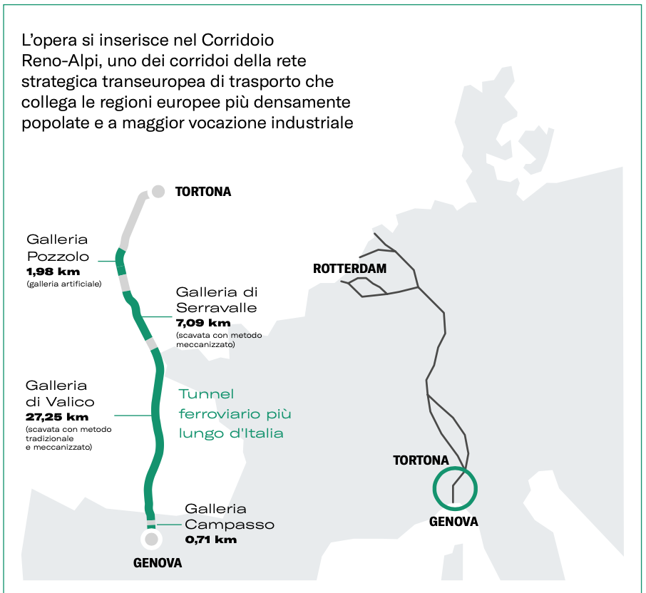 Il tunnel principale del Terzo valico è suddiviso in cinque cantieri e gli scavi vengono effettuati sia da Nord che da Sud.