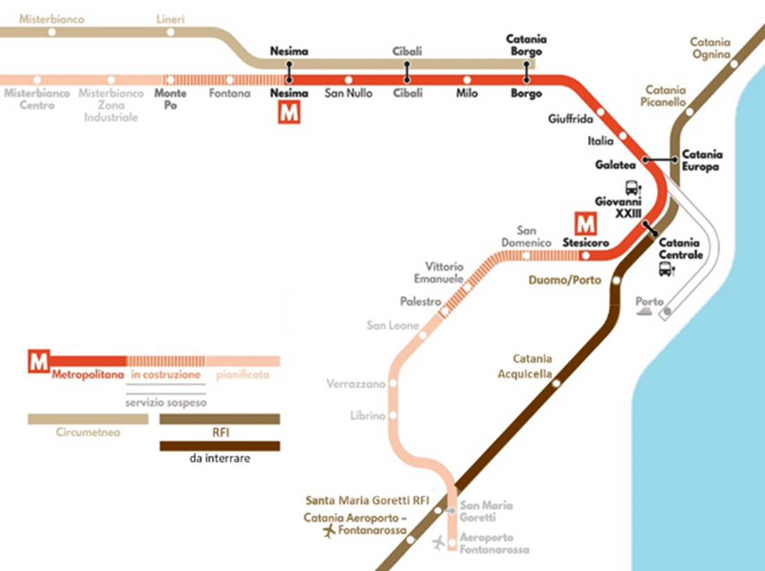 Il sistema di trasporto metropolitano su ferro nel capoluogo etneo, a interventi ultimati, disporrà di circa 80 km di rete e 54 fermate o stazioni, a cui si aggiunge la già esistente linea di superficie della Ferrovia Circumetnea di 107,4 km con 35 fermate o stazioni.