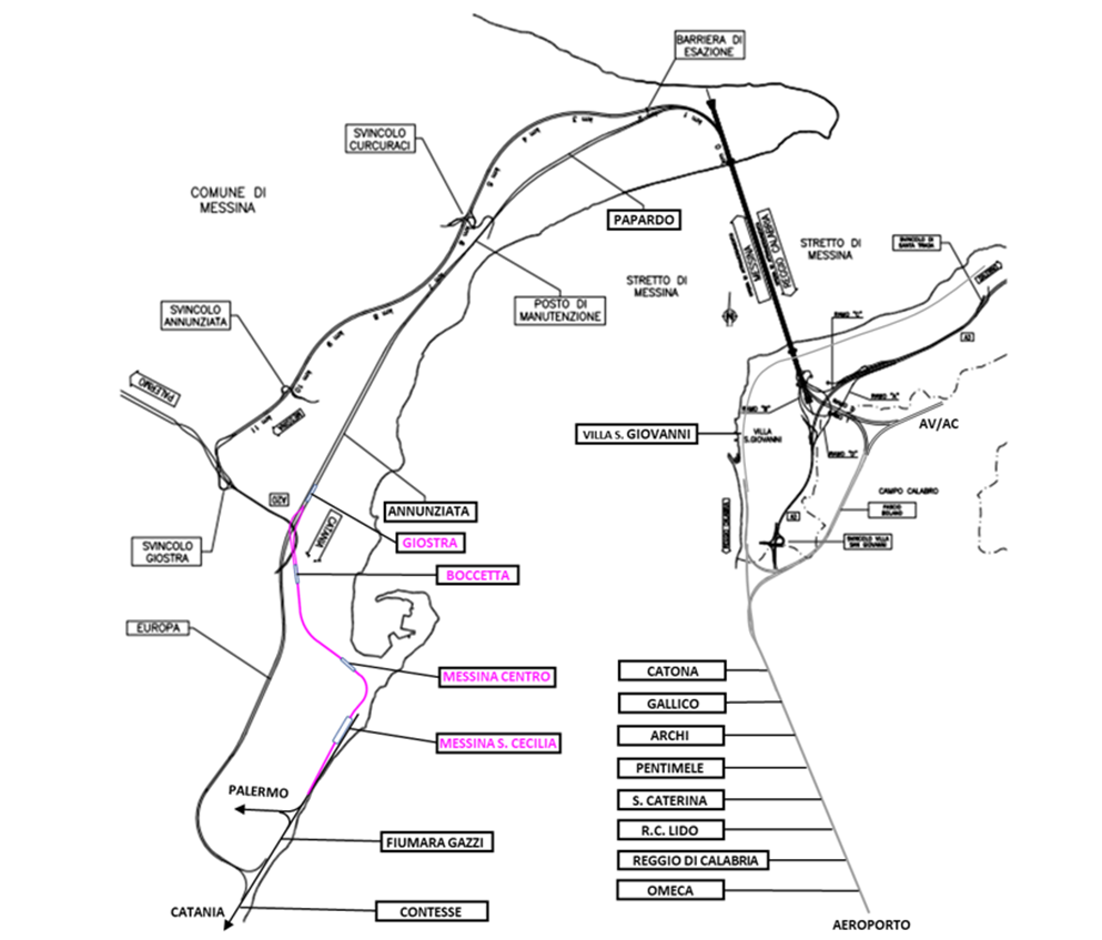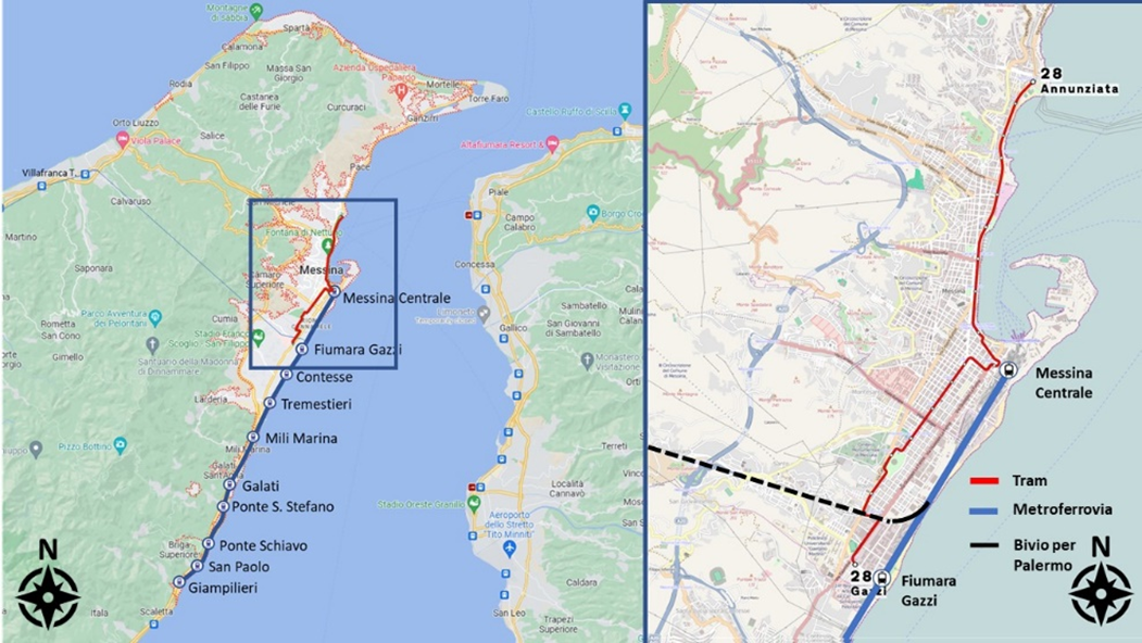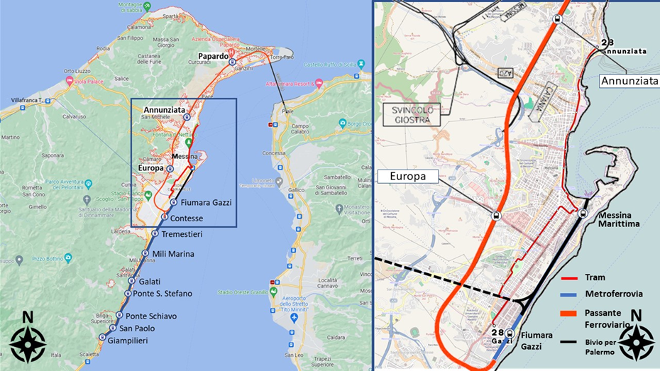 Nel 2003 è stata attivata la tranvia n 28 da Gazzi-ZIR fino alla Annunziata -Museo, di 7,7 km con 18 fermate e scambio nel piazzale di Messina Centrale, con il terminal Bus e le banchine del porto. Con la realizzazione del Ponte sullo Stretto è previsto: un collegamento ferroviario a doppio binario, di gronda e quasi del tutto in galleria, tra la stazione di Contesse (diramazione dei treni per il “continente”) e il Ponte sullo Stretto (linearossa più spessa di figura 4), lo spostamento della stazione di Messina centrale a Messina Fiumara Gazzi (di