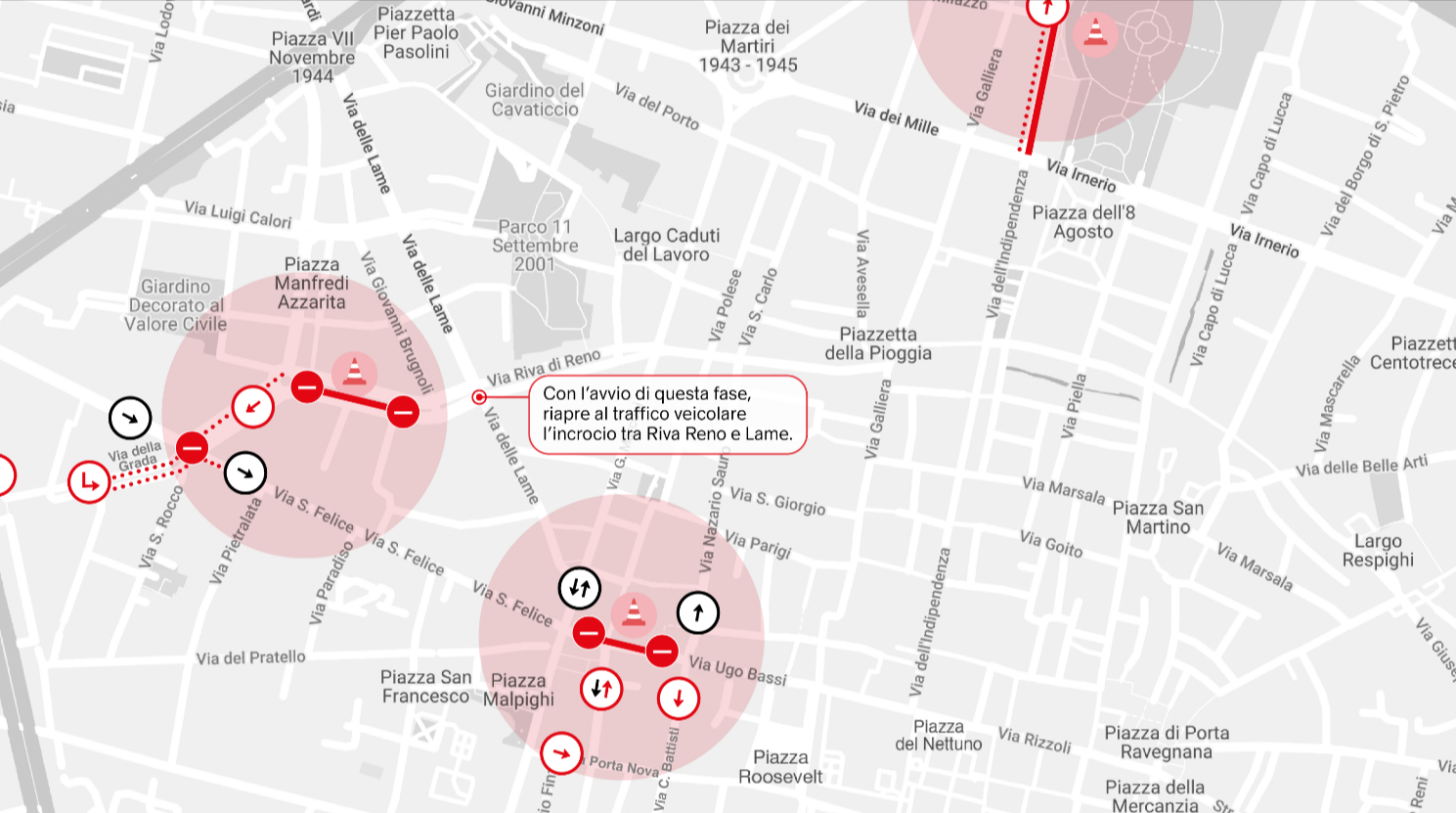 Il cantiere interessa anche via Riva di Reno, tra la rotonda di piazza Azzarita e l’incrocio con via San Felice. Rimarrà percorribile una corsia verso via della Grada, con tutti i passi carrai accessibili. Gli autorizzati alla ZTL potranno aggirare il cantiere percorrendo via della Grada e utilizzando il “torna indietro” per tornare in direzione di via San Felice e svoltare a destra. Il traffico non autorizzato potrà invece procedere in via Calari, che cambierà senso di marcia nel suo ultimo tratto, per poi immettersi in viale Vicini.