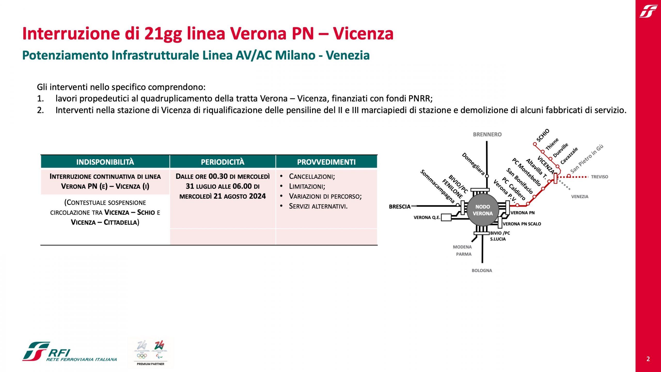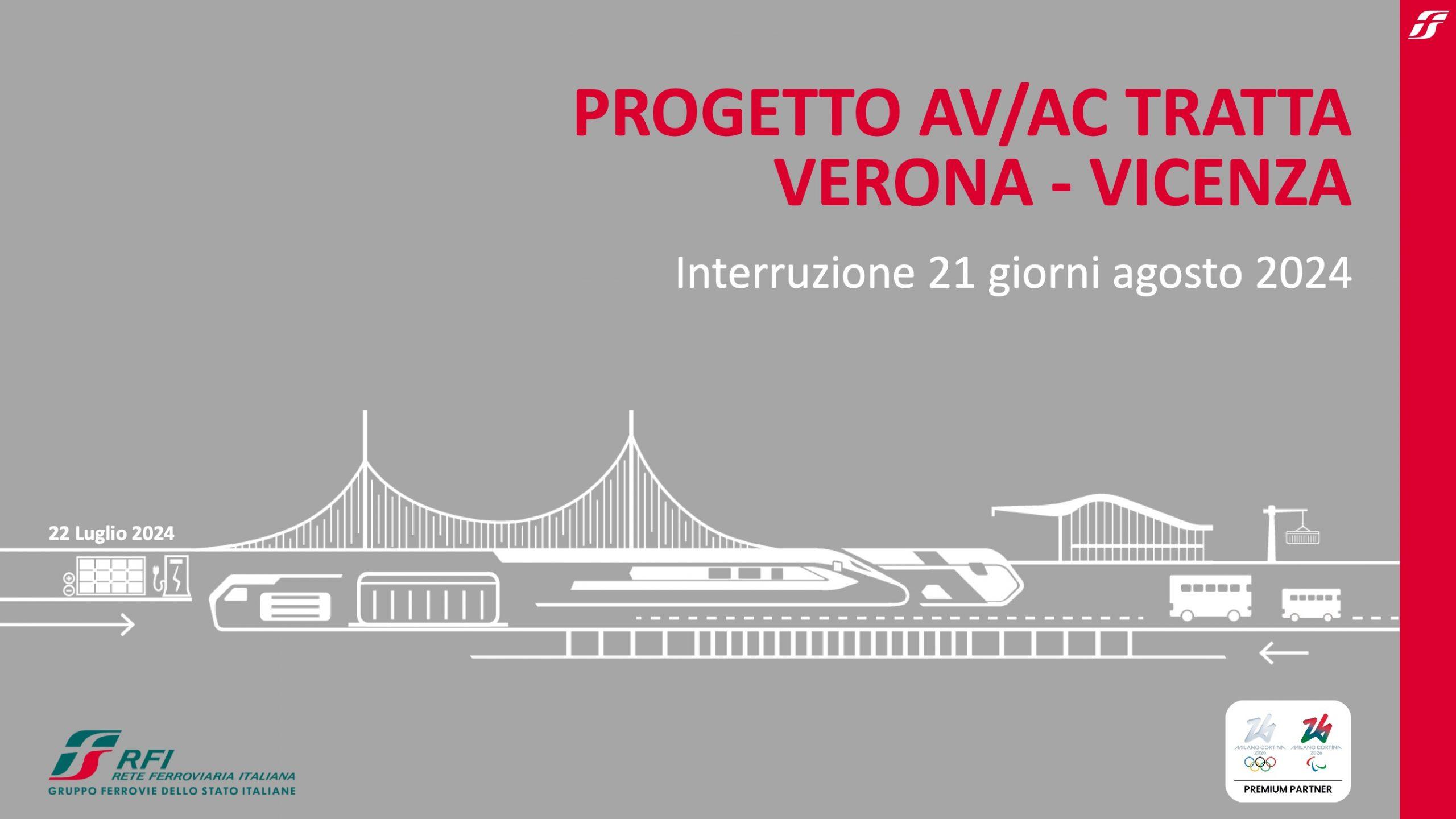 Dal 31 luglio al 21 agosto 2024, il tratto ferroviario tra Verona Porta Nuova e Vicenza subirà significative modifiche a causa dei lavori per il completamento della linea ad Alta Velocità/Alta Capacità (AV/AC) Verona-Padova.