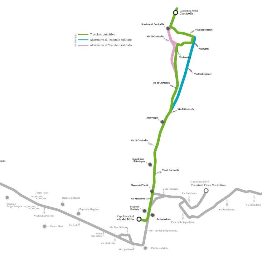 Il tracciato parte dal capolinea sud in Via dei Mille, attraversa il cuore della città su Via Indipendenza, e prosegue verso nord passando per Via Matteotti e il quartiere Bolognina, seguendo in parte il percorso già previsto per la Linea Rossa.
