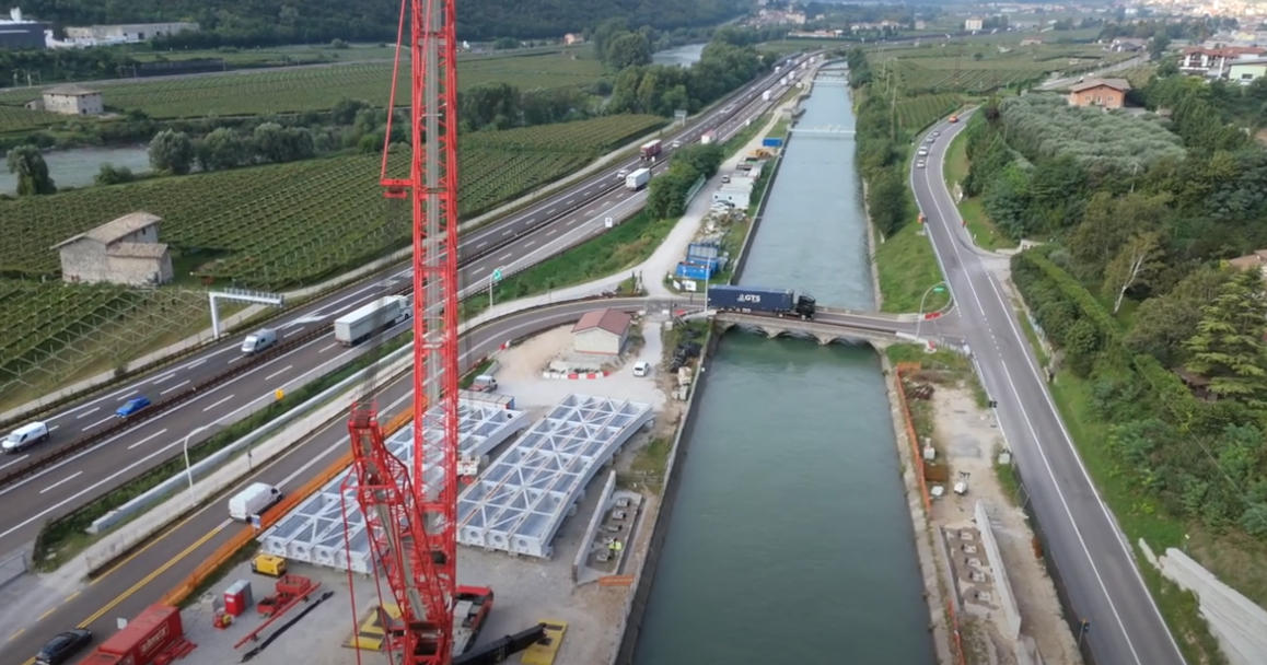 In soli dieci minuti, grazie all’utilizzo di una delle gru più grandi d’Italia, è stato posizionato il viadotto da 150 tonnellate sul canale Biffis, elemento cruciale per la nuova configurazione viabilistica della stazione autostradale A22 di Ala Avio, in provincia di Trento.