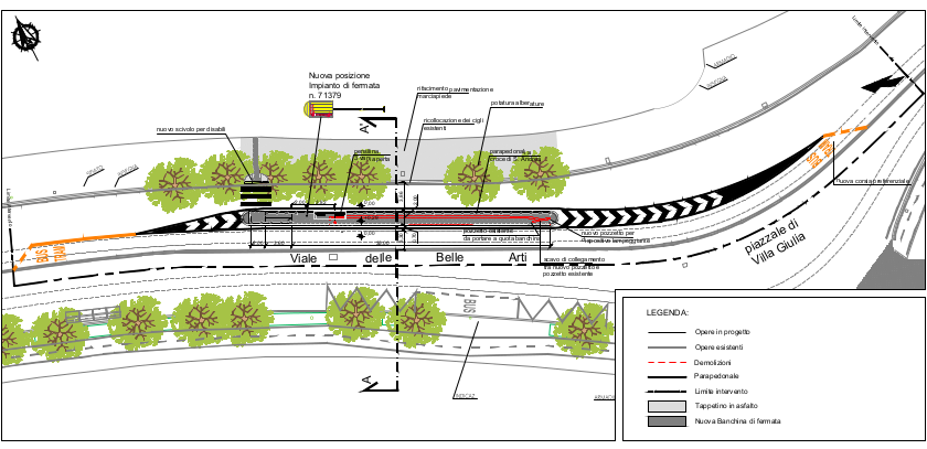 L’impianto di fermata in viale delle Belle Arti, che serve le linee tram 2 e 19, sarà anch’esso oggetto di un importante adeguamento. Attualmente, la banchina è stretta (circa 1,30 metri) e non dispone di un attraversamento pedonale adeguato.