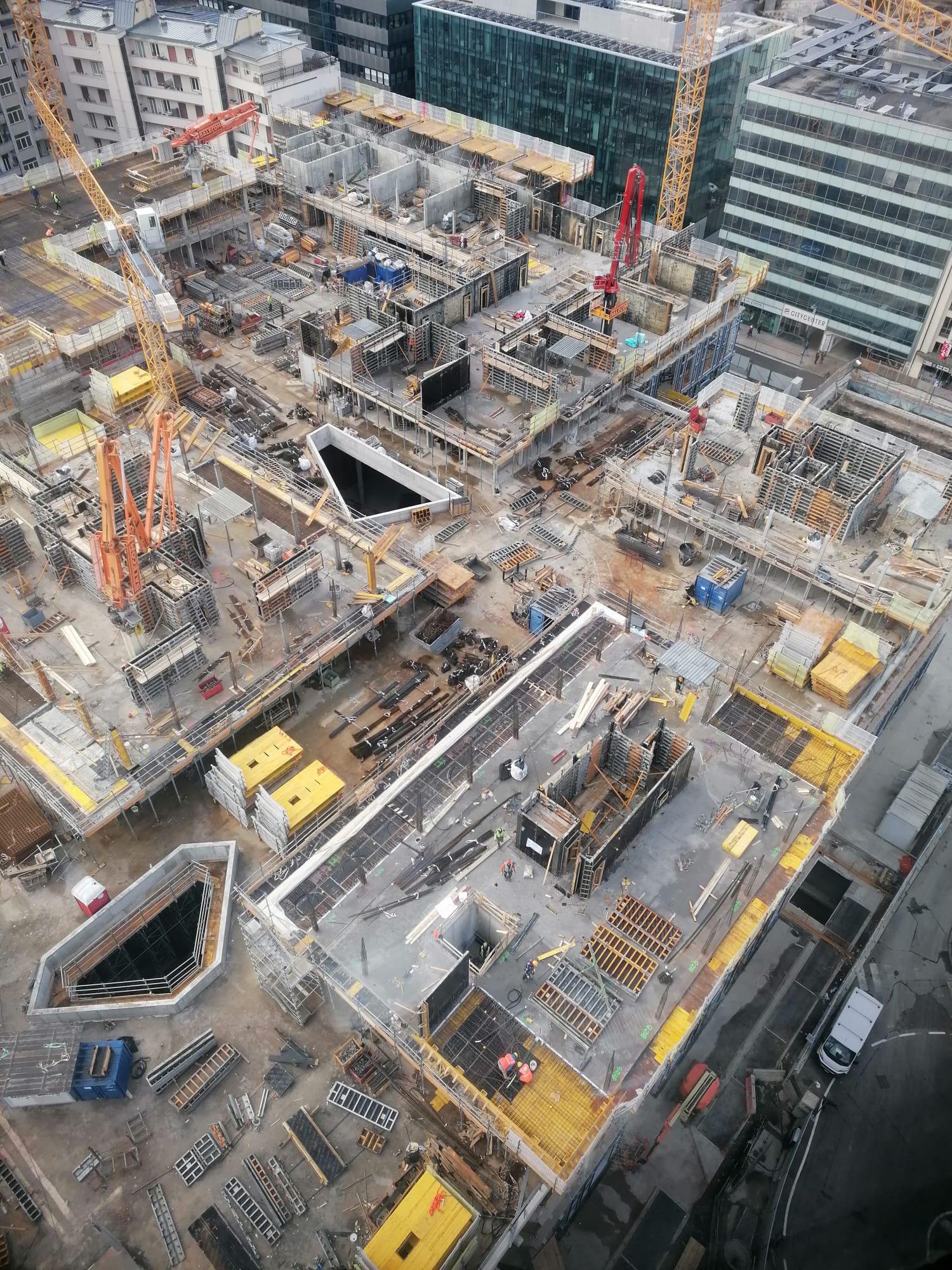 Per l’area di carico, caratterizzata da luci fino a 20 metri, sono state impiegate massicce travi composte in acciaio-calcestruzzo per sostenere gli edifici sovrastanti.