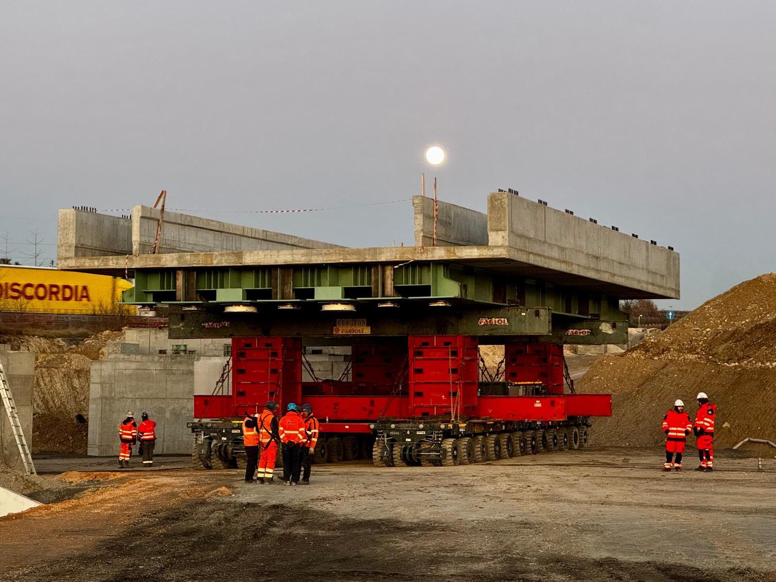 La struttura, dal peso di circa 650 tonnellate e completa di travi, soletta e marciapiedi, è stata posizionata in modo da consentire il passaggio della nuova linea ferroviaria sopra lo svincolo autostradale.