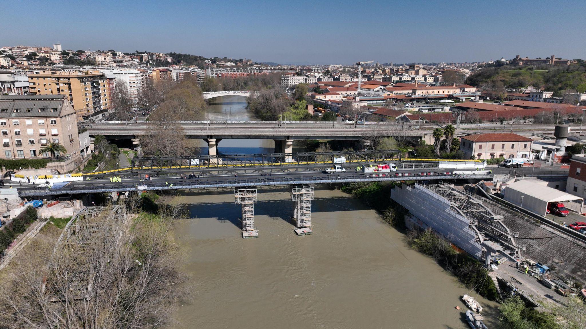 La presenza di numerosi sottoservizi nell’area di montaggio ha richiesto un posizionamento iniziale del ponte a una quota superiore di 2,5 metri rispetto al piano viabile, per poi essere abbassato progressivamente di circa 20 cm al giorno fino alla posizione definitiva.