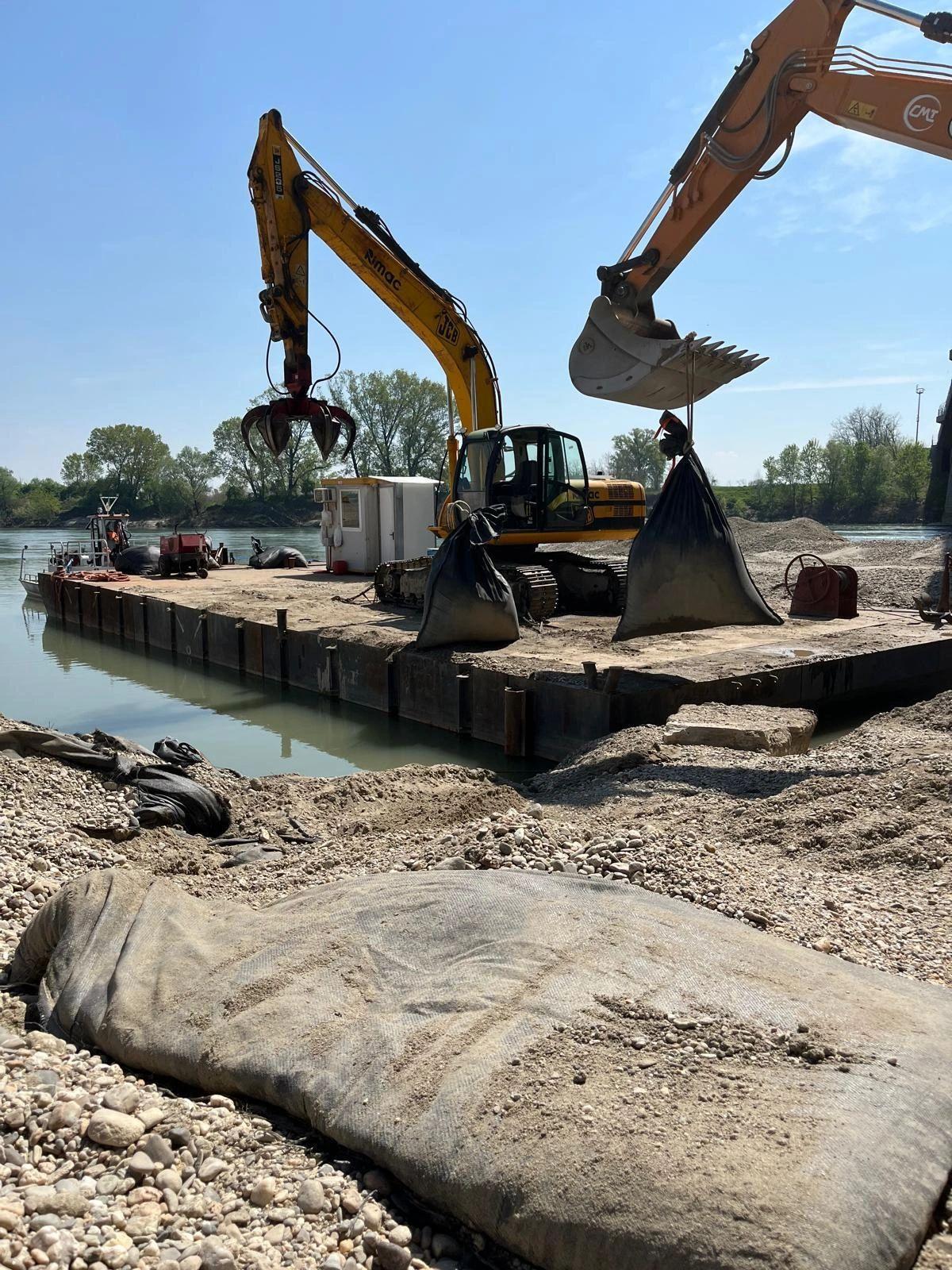 Gli operai stanno lavorando direttamente sul letto del fiume con l’ausilio di un pontone, un mezzo galleggiante che consente di intervenire in punti altrimenti inaccessibili.