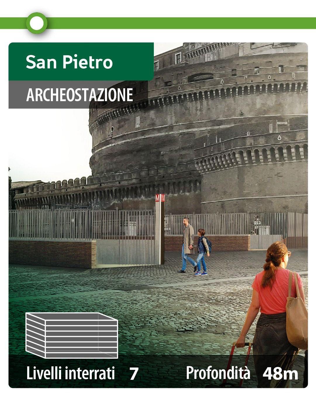- San Pietro, all’interno dei giardini di Castel Sant’Angelo, sarà la più profonda della tratta, con sette livelli interrati fino a 48 metri.