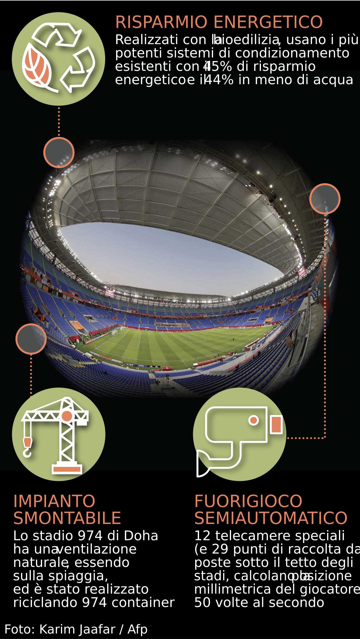 Gli otto impianti in cui si giocheranno le partite di calcio sono stati costruiti e ammodernati proprio per l’occasione e sono tutti concentrati nel giro di 30km di distanza l’uno dall’altro, nei pressi della capitale Doha.