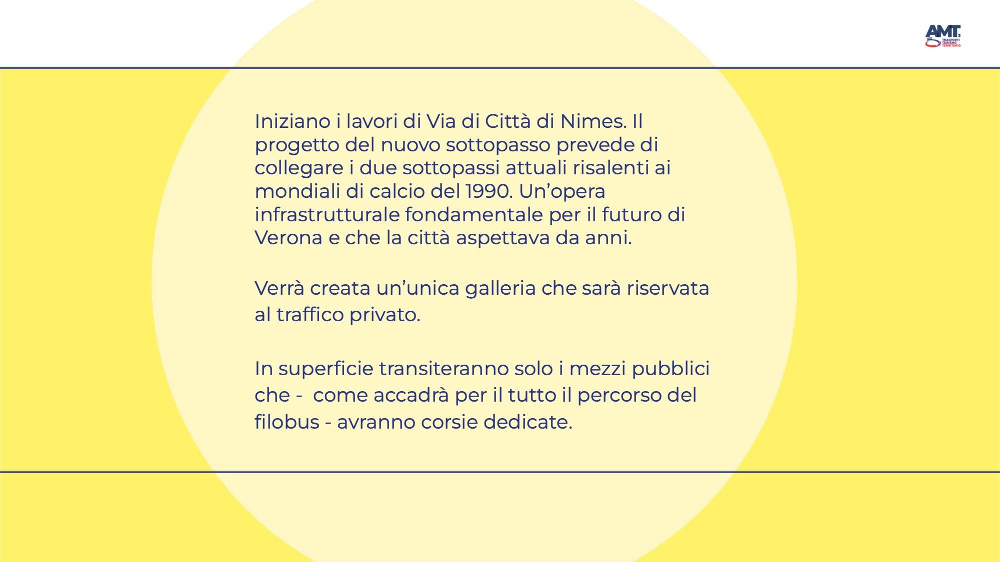 Il primo cantiere del filobus parte il 21 aprile, dopo Vinitaly 2023, in via Città di Nimes, e unirà i due sottopassi esistenti in un’unica galleria che, una volta terminata sarà riservata al traffico privato.