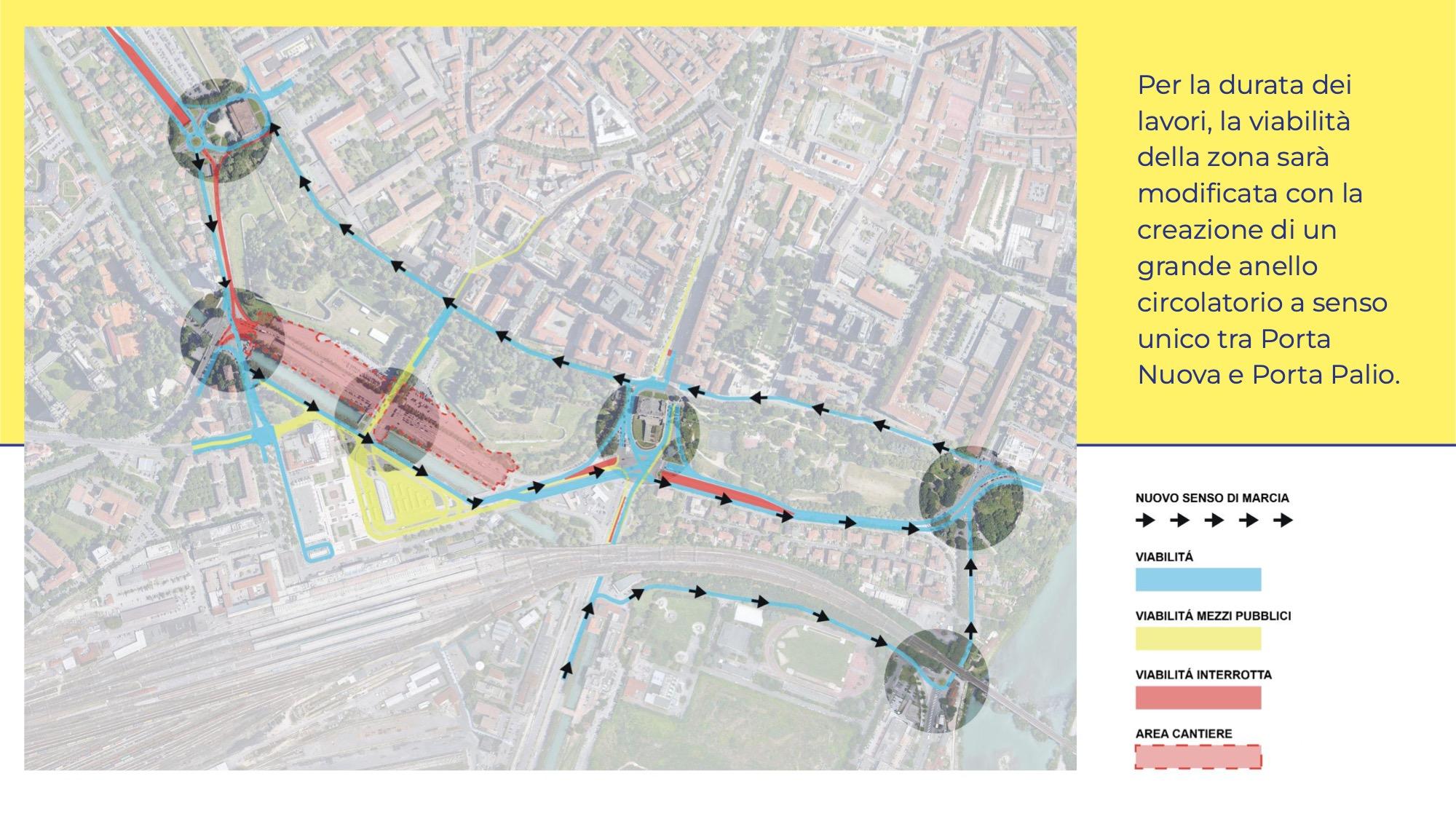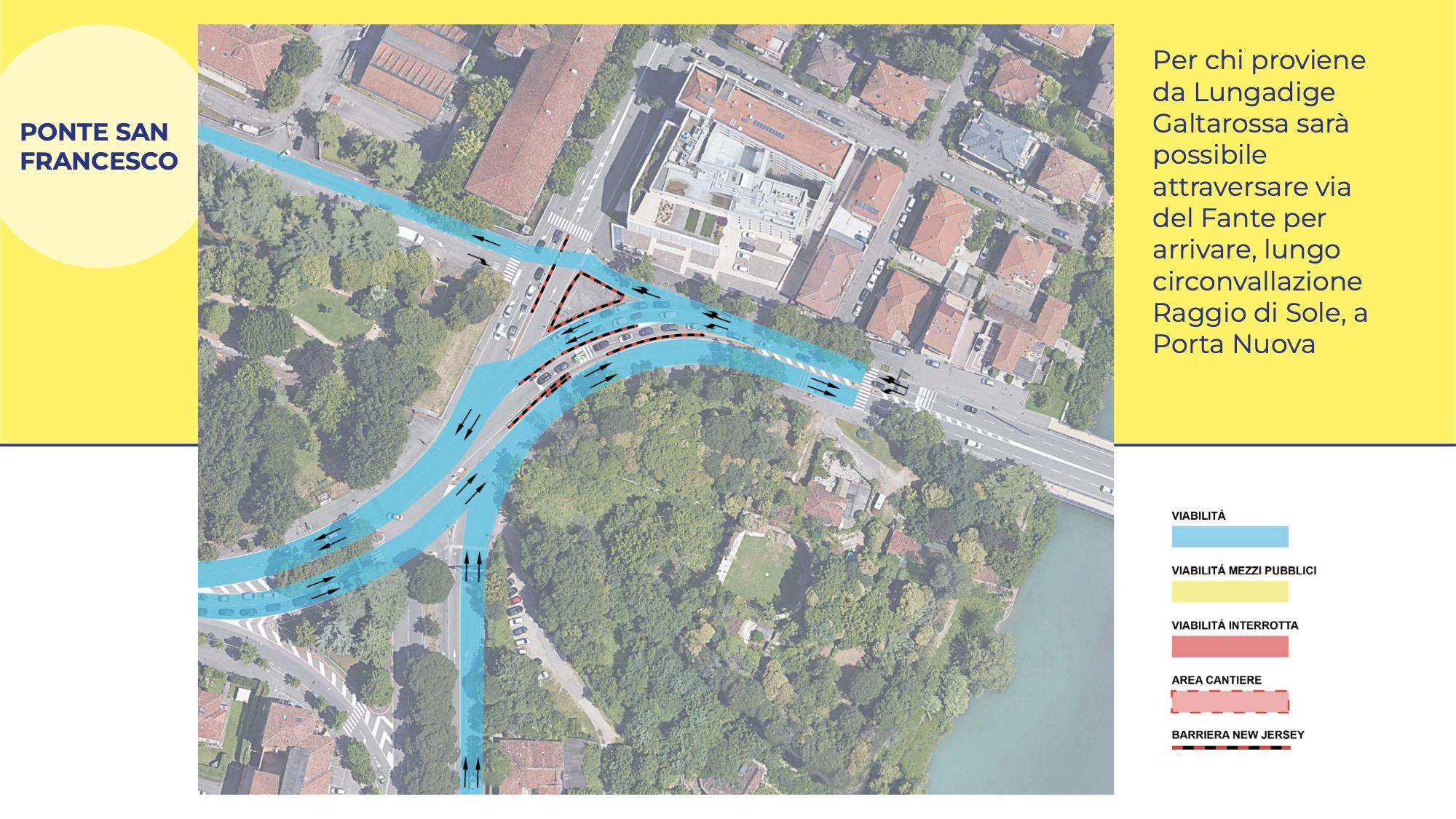Ponte San Francesco. Per chi proviene da Lungadige Galtarossa sarà possibile attraversare via del Fante per arrivare, lungo circonvallazione Raggio di Sole, a Porta Nuova.