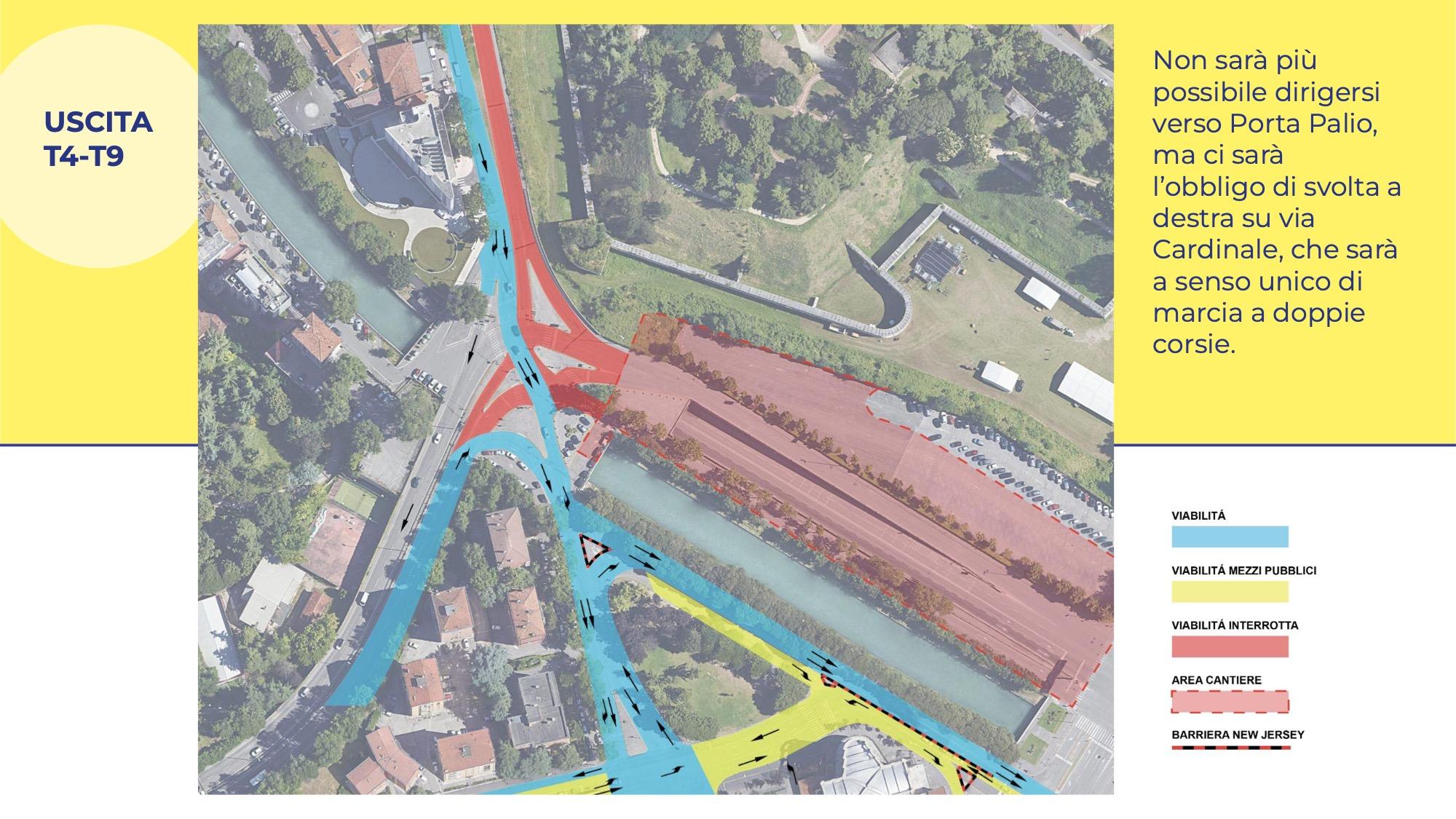 Uscita T4 T9. Non sarà più possibile dirigersi verso Porta Palio, ma ci sarà l’obbligo di svolta a destra su via Cardinale, che sarà a senso unico di marcia a doppie corsie.