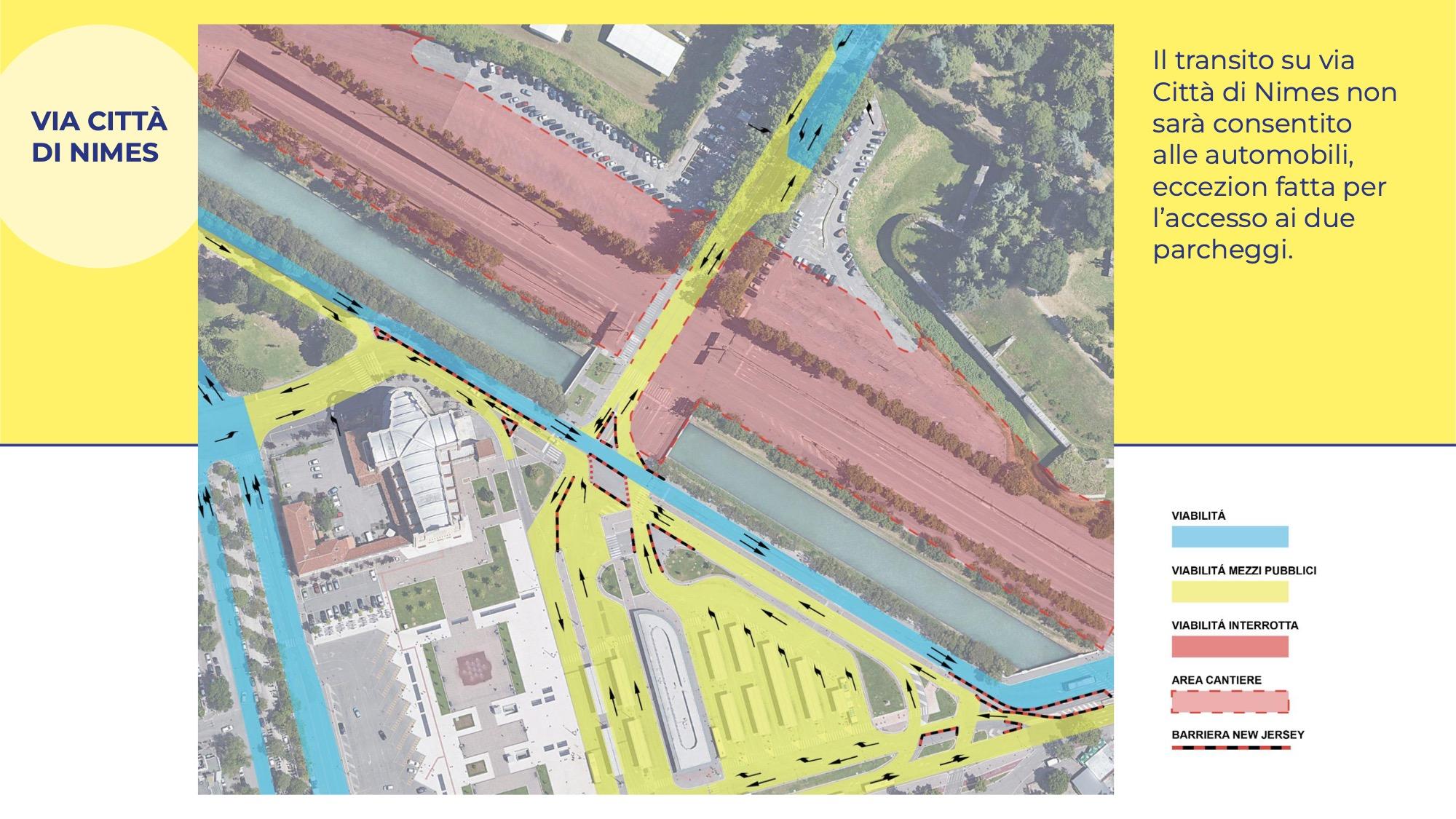 Queste le principali modifiche viabilistiche legate al cantiere di via Città di Nimes.