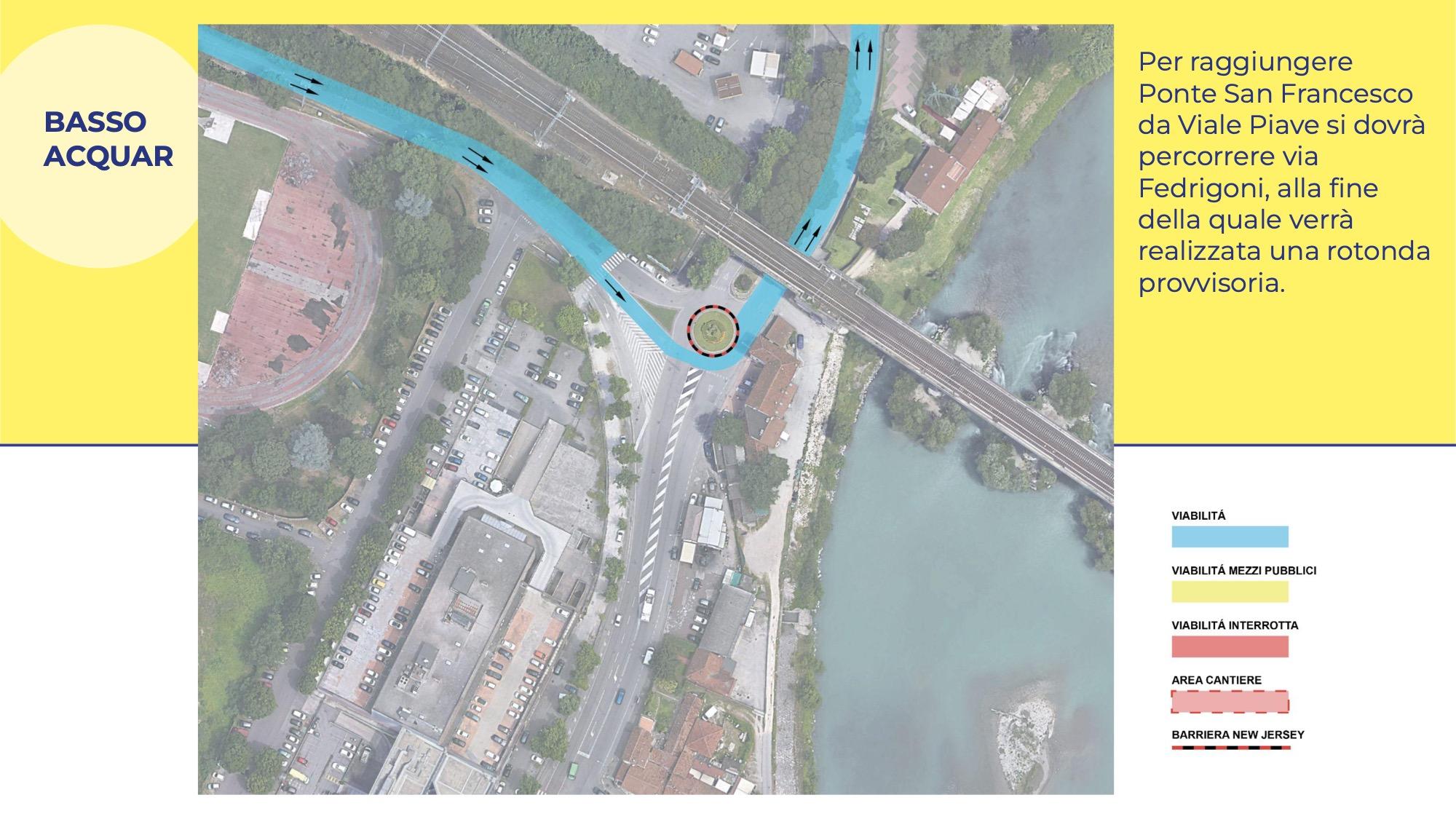 Basso Acquar. Per raggiungere Ponte San Francesco da Viale Piave si dovrà percorrere via Fedrigoni, alla fine della quale verrà realizzata una rotonda provvisoria.